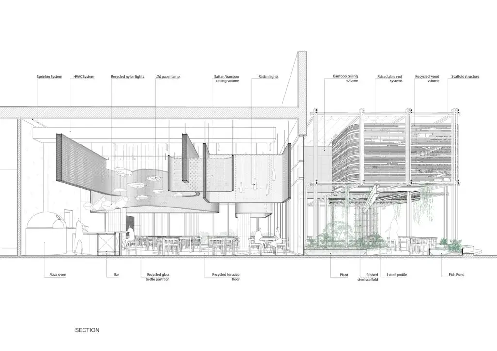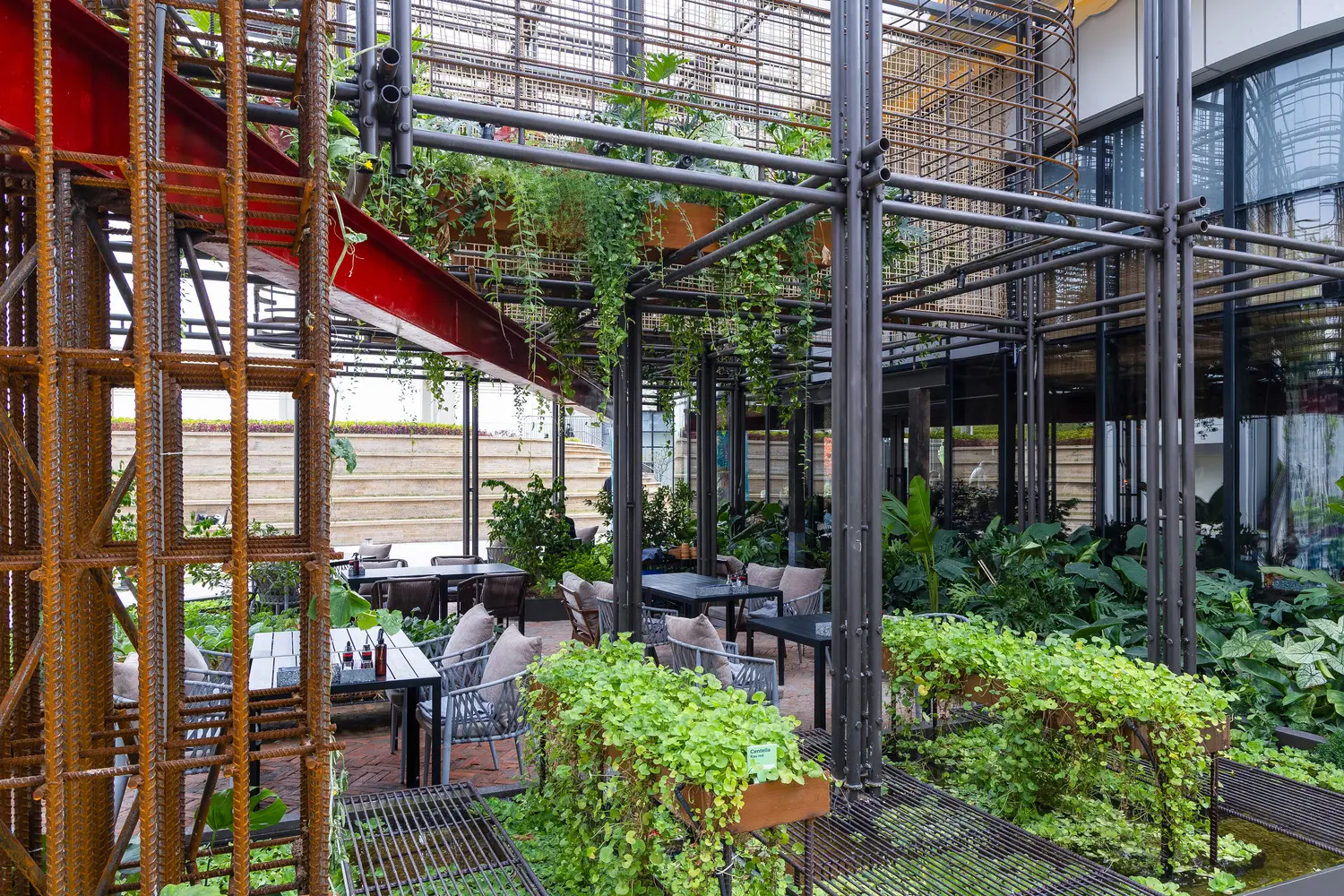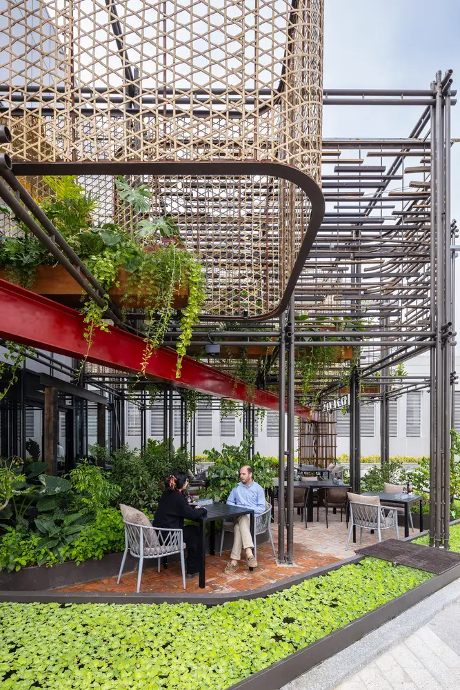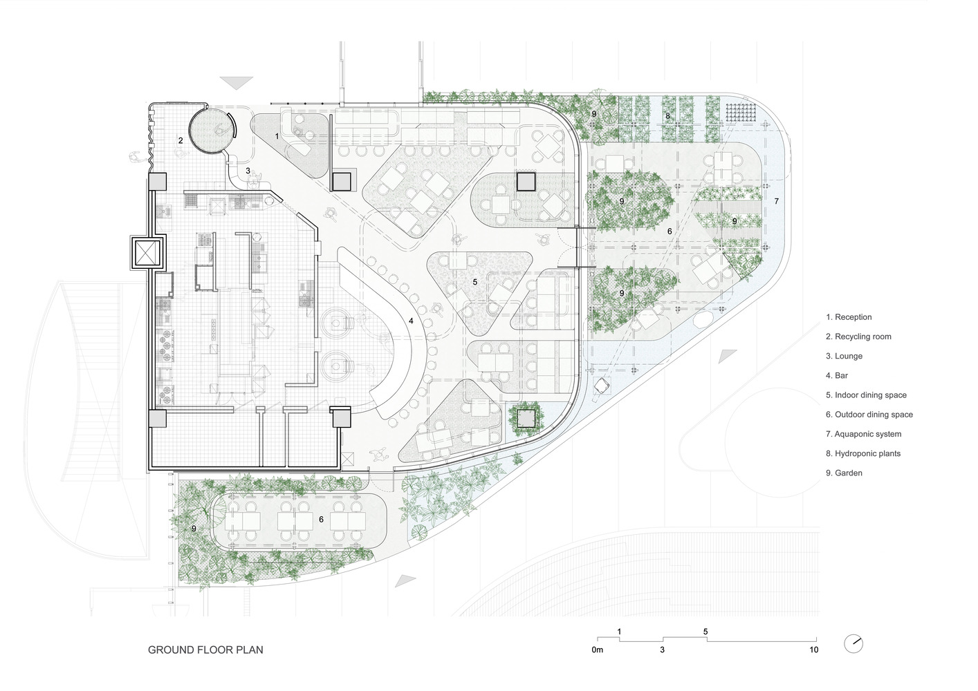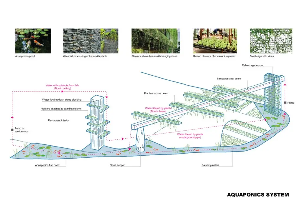 Hòa nhập với Thiên nhiên: Ranh giới không gian bên ngoài được xác định bởi mặt nước và hệ thống thủy canh, cung cấp dinh dưỡng cho cả cây trồng ngoài trời và trong nhà, cũng như rau củ phục vụ nhà hàng. Hệ thống này giúp tăng khả năng làm mát của không gian, đồng thời mang lại giá trị giáo dục, mang đến những trải nghiệm và hiểu biết về thiên nhiên. Hệ thống thủy canh nâng cao uy tín bền vững của nhà hàng, đồng thời góp phần tạo nên một môi trường ngoài trời mát mẻ và hấp dẫn hơn.
