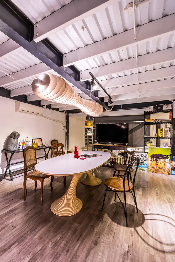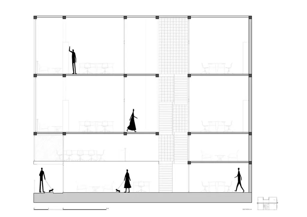 Kết cấu thép tạo nên một không gian ba chiều phức tạp, với các khu vực được bố trí phù hợp với nhu cầu đa dạng và thay đổi của người thuê. Trần nhà cao gấp đôi xen kẽ với các tầng lửng thấp hơn, cho phép sử dụng không gian sáng tạo tràn ngập ánh sáng một cách linh hoạt. Bao gồm quán cà phê, phòng trưng bày nội thất, căn hộ và văn phòng, cũng như sân thượng, kết cấu thép và các yếu tố mặt tiền dạng tấm trượt và gấp nhẹ cho phép kiểm soát ánh sáng, bóng râm và không khí, làm mờ ranh giới giữa bên trong và bên ngoài. Khu vườn xung quanh – với các loại cây nhiệt đới, cây rèm rủ từ mái nhà và các chậu cây đặt ở cửa sổ – mang thiên nhiên vào bên trong và tạo ra một nơi để nghỉ ngơi và giao lưu thân mật giữa những người sáng tạo khác nhau.