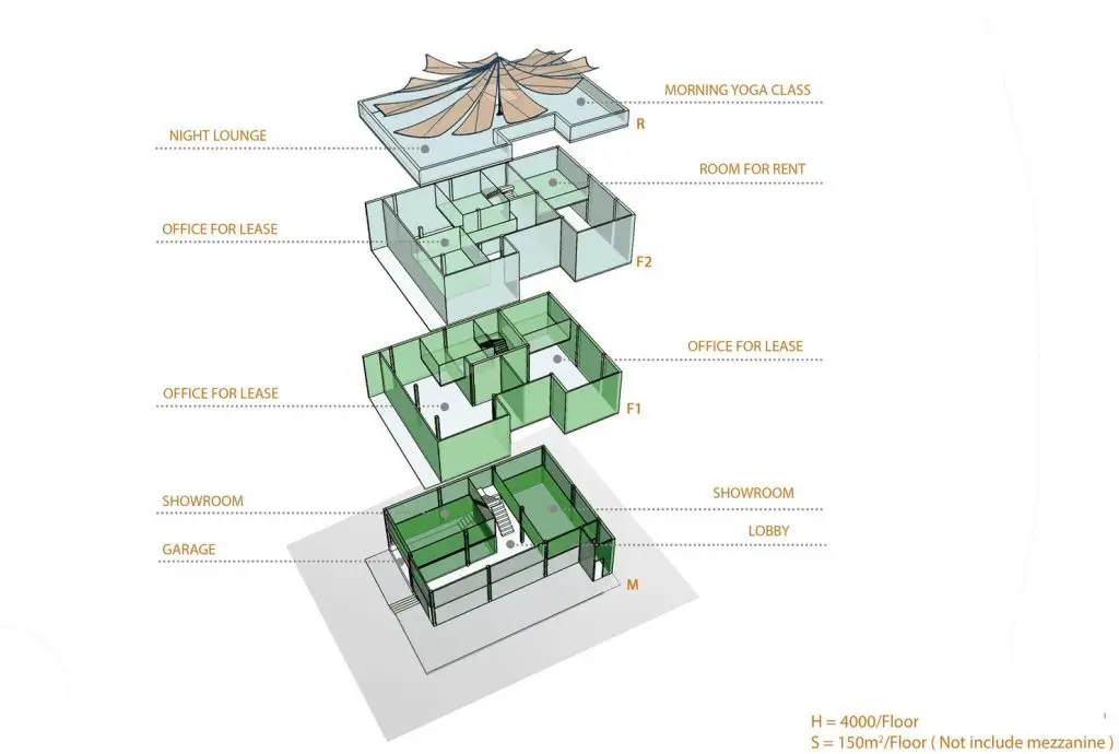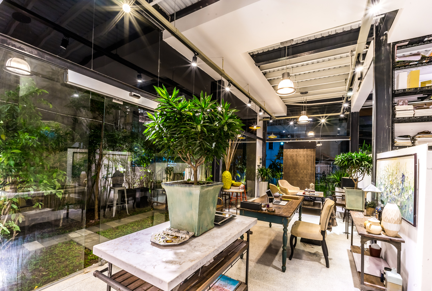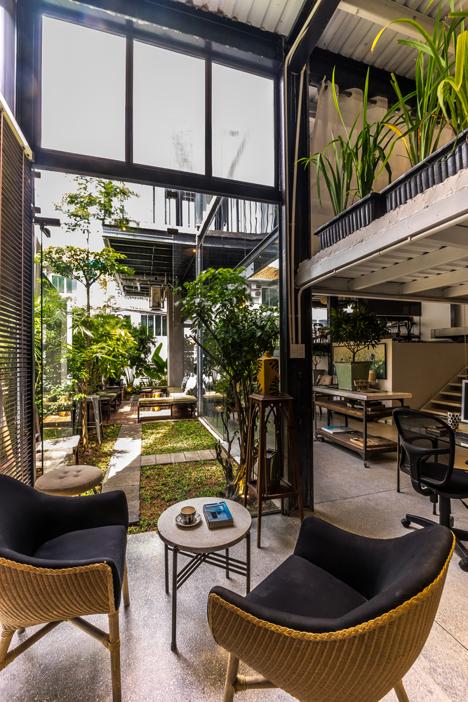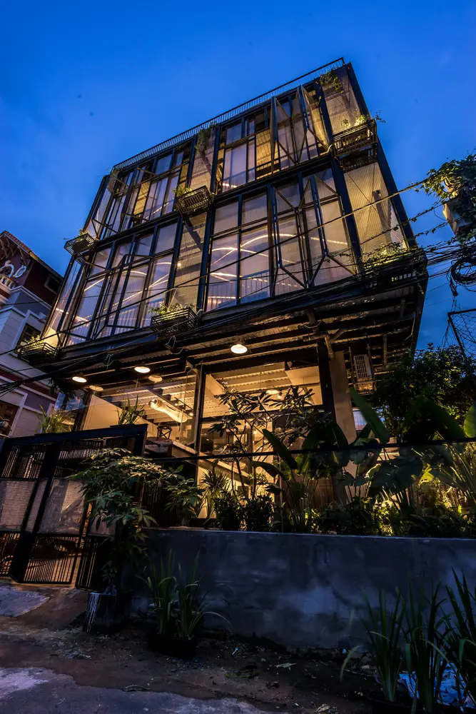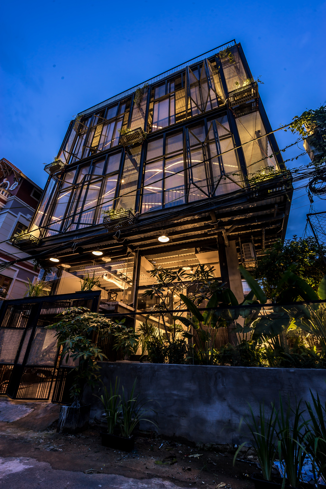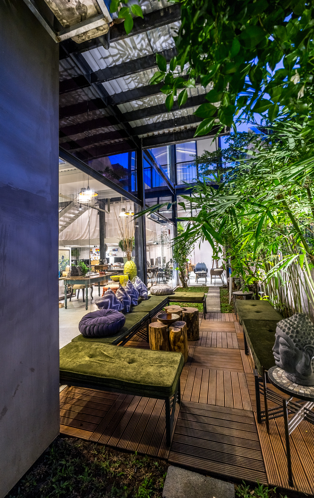 Kết cấu thép tạo nên một không gian ba chiều phức tạp, với các khu vực được bố trí phù hợp với nhu cầu đa dạng và thay đổi của người thuê. Trần nhà cao gấp đôi xen kẽ với các tầng lửng thấp hơn, cho phép sử dụng không gian sáng tạo tràn ngập ánh sáng một cách linh hoạt. Bao gồm quán cà phê, phòng trưng bày nội thất, căn hộ và văn phòng, cũng như sân thượng, kết cấu thép và các yếu tố mặt tiền dạng tấm trượt và gấp nhẹ cho phép kiểm soát ánh sáng, bóng râm và không khí, làm mờ ranh giới giữa bên trong và bên ngoài. Khu vườn xung quanh – với các loại cây nhiệt đới, cây rèm rủ từ mái nhà và các chậu cây đặt ở cửa sổ – mang thiên nhiên vào bên trong và tạo ra một nơi để nghỉ ngơi và giao lưu thân mật giữa những người sáng tạo khác nhau.