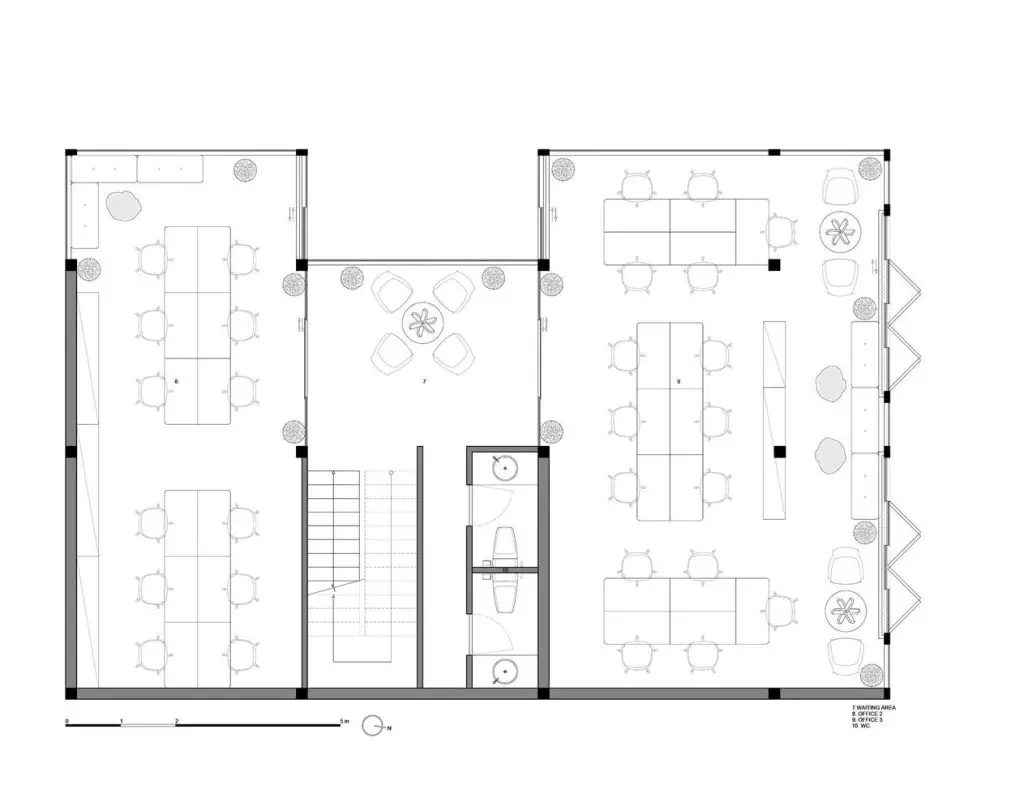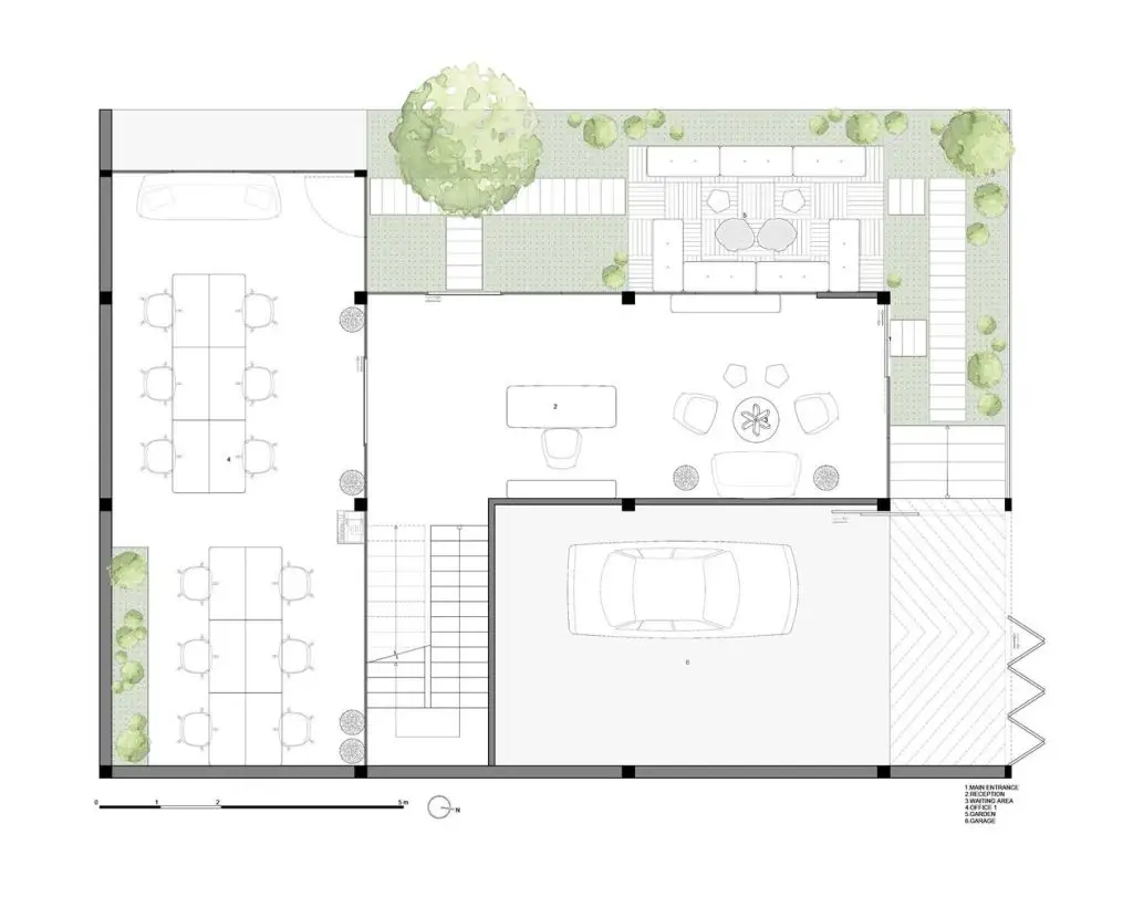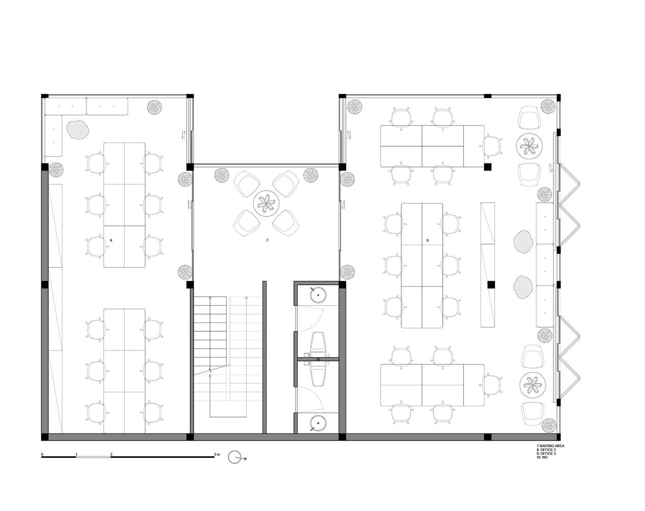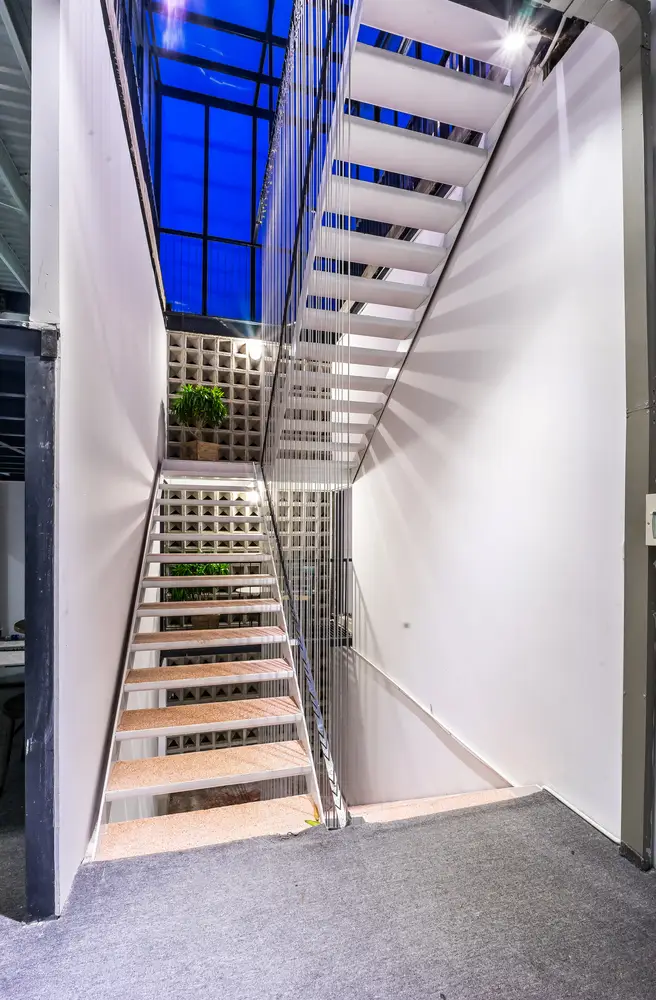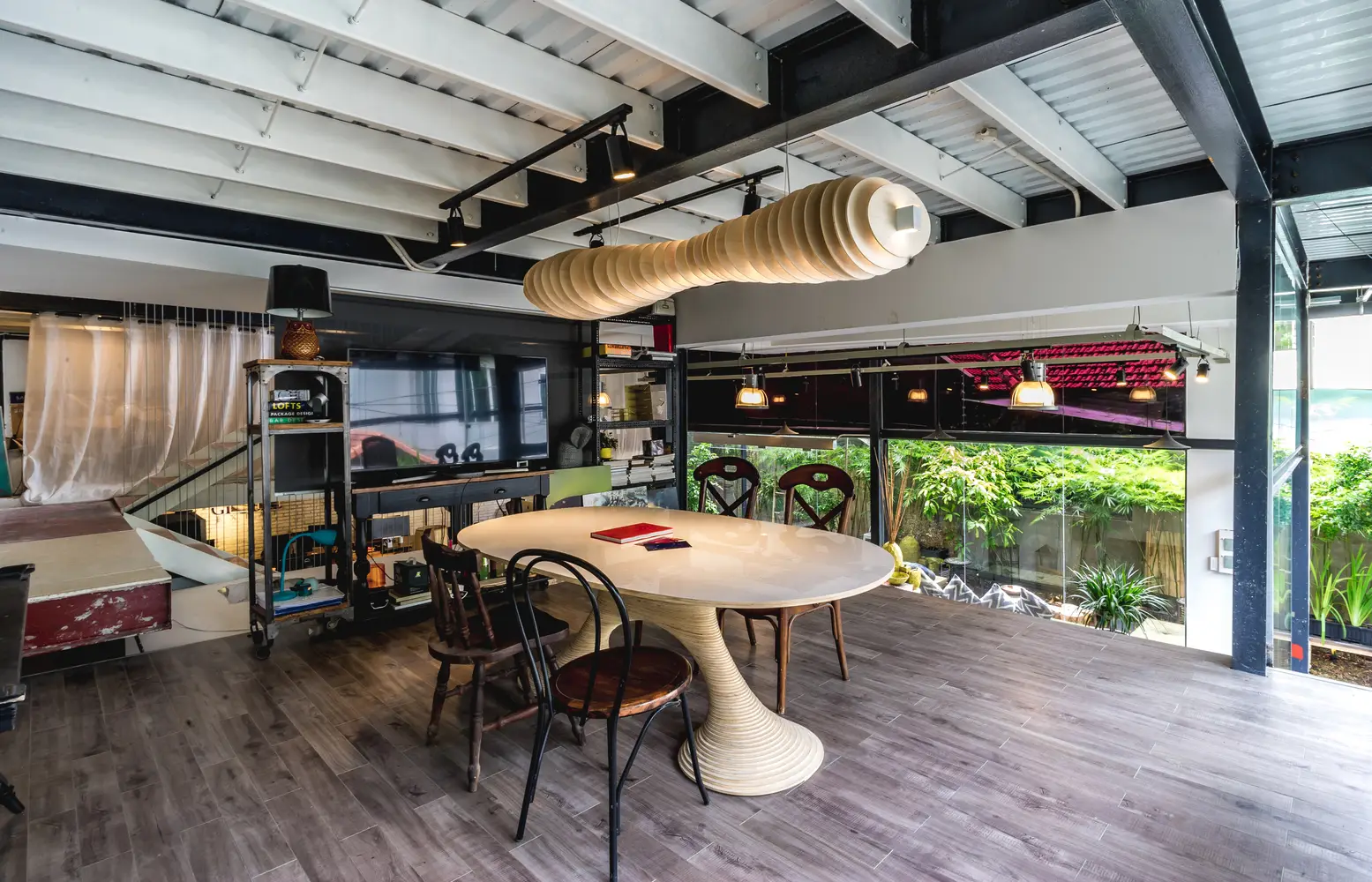 Kết cấu thép tạo nên một không gian ba chiều phức tạp, với các khu vực được bố trí phù hợp với nhu cầu đa dạng và thay đổi của người thuê. Trần nhà cao gấp đôi xen kẽ với các tầng lửng thấp hơn, cho phép sử dụng không gian sáng tạo tràn ngập ánh sáng một cách linh hoạt. Bao gồm quán cà phê, phòng trưng bày nội thất, căn hộ và văn phòng, cũng như sân thượng, kết cấu thép và các yếu tố mặt tiền dạng tấm trượt và gấp nhẹ cho phép kiểm soát ánh sáng, bóng râm và không khí, làm mờ ranh giới giữa bên trong và bên ngoài. Khu vườn xung quanh – với các loại cây nhiệt đới, cây rèm rủ từ mái nhà và các chậu cây đặt ở cửa sổ – mang thiên nhiên vào bên trong và tạo ra một nơi để nghỉ ngơi và giao lưu thân mật giữa những người sáng tạo khác nhau.