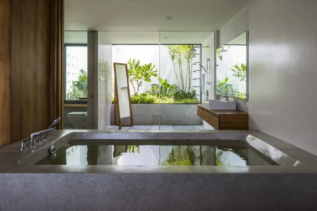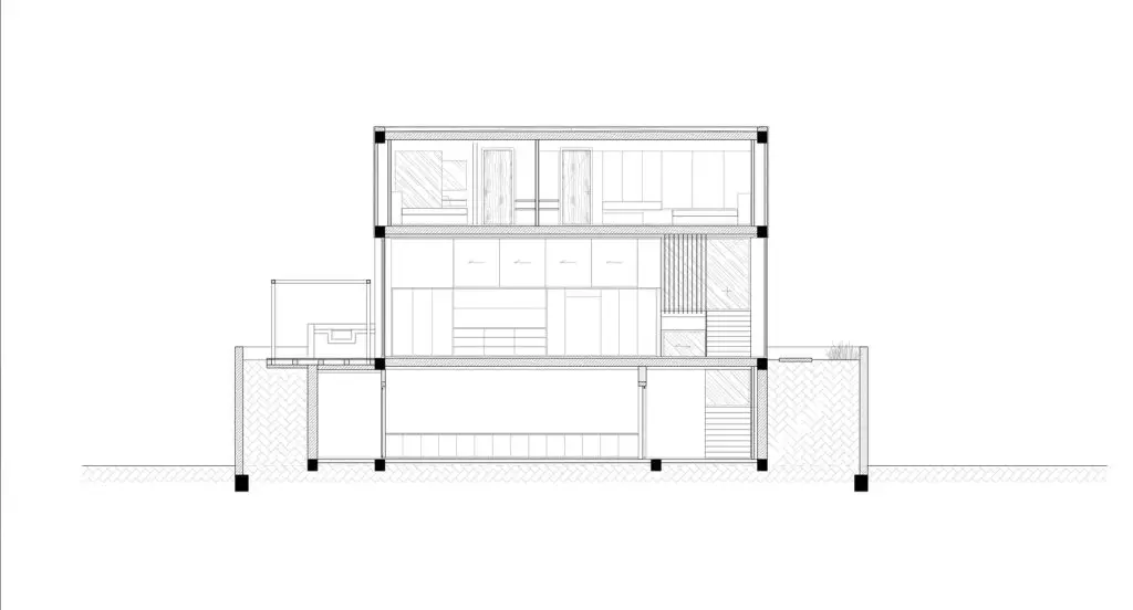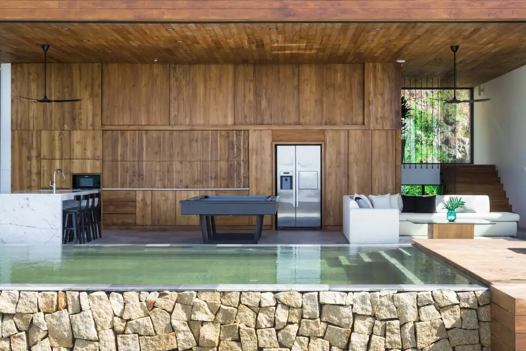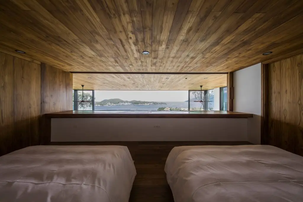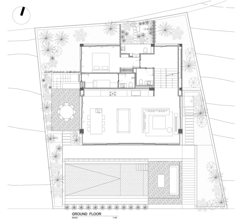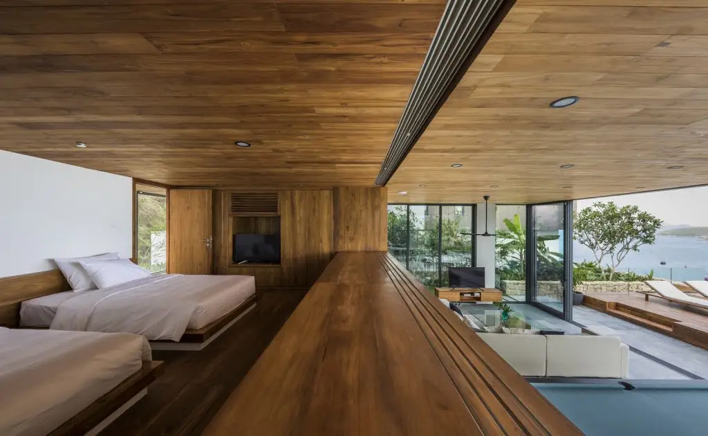 Xét đến đặc điểm của khu đất với vách đá phía sau và mặt đường thấp hơn, công trình được bố trí trải dài theo chiều dọc, trên nhiều tầng. Ở tầng trệt, có gara và một phòng chiếu phim gia đình lớn phía sau hồ bơi với cửa sổ dưới nước đón ánh sáng mặt trời tự nhiên xuyên qua hồ bơi, các không gian kỹ thuật và spa ở phía sau. Ở tầng trung gian, hướng ra vách đá, là một phòng ngủ sang trọng với khu vườn riêng và phòng tắm ngoài trời. Tầng trệt là không gian chính, nơi đảo bếp, nhà bếp và phòng khách được kết hợp thành một không gian duy nhất, kết nối liền mạch với không gian ngoài trời. Trần nhà cao cho phép bố trí thêm một tầng lửng, được chuyển đổi thành một phòng ngủ sang trọng với tầm nhìn toàn cảnh ra nhà bếp. Khối nhà bằng gỗ là tầng một với 2 phòng ngủ sang trọng.