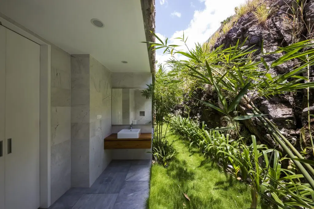 Những khối đá khai thác tại địa phương kết nối công trình với môi trường đá xung quanh, và lớp ốp gỗ tếch làm tăng hiệu ứng “lơ lửng” bằng cách bao bọc toàn bộ khối nhà tầng một. Sự kết hợp vật liệu này mang lại cảm nhận hiệu quả về các khối kiến trúc.