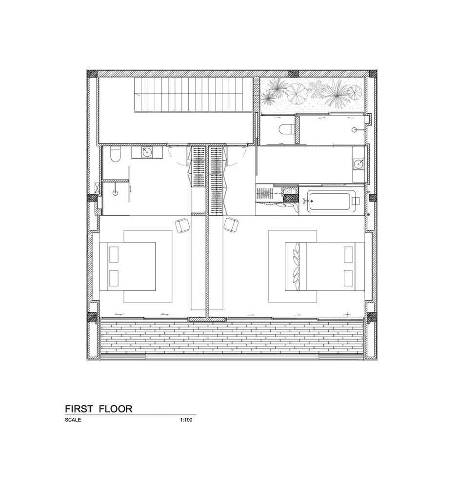 Xét từ góc độ cho thuê nghỉ dưỡng, mục tiêu là tối đa hóa khả năng đón tiếp và trải nghiệm giải trí. Ngôi nhà có lối vào từ đường chính với cầu thang ngoài trời dẫn lên tầng thượng.