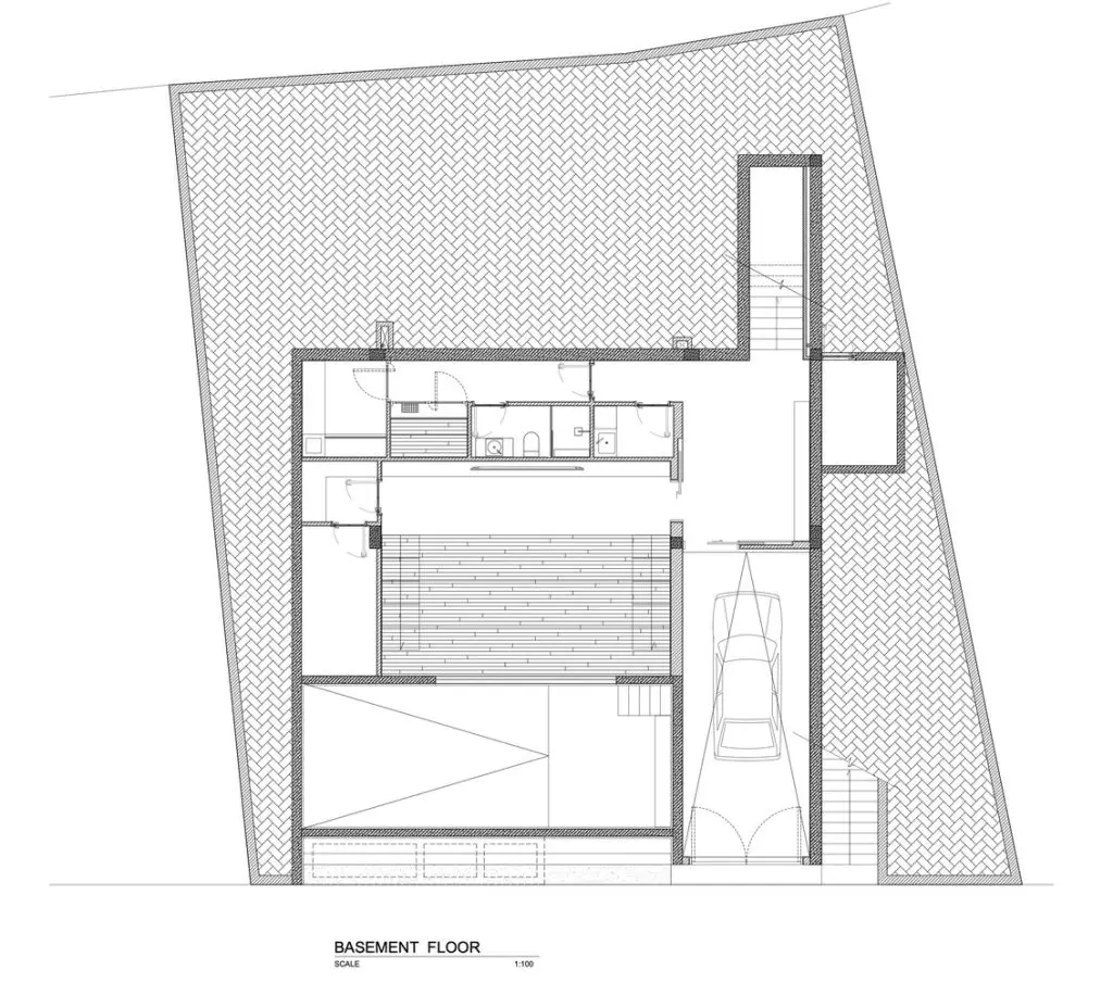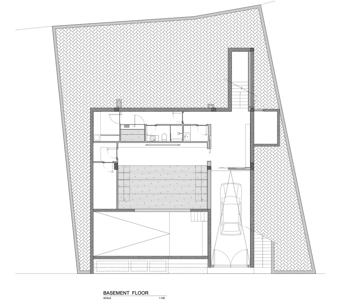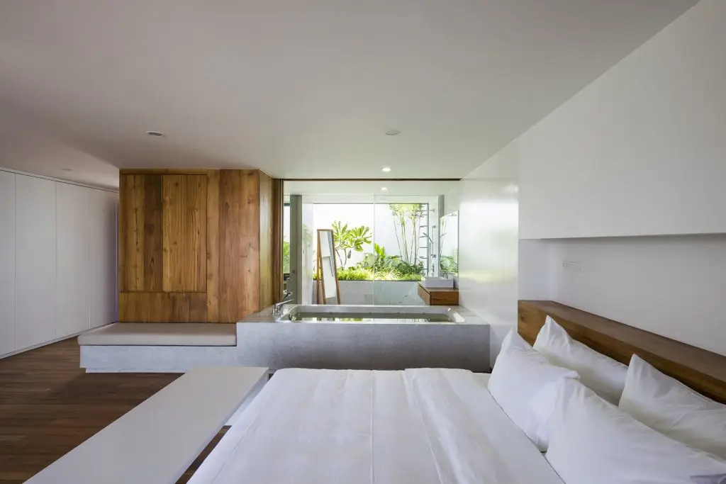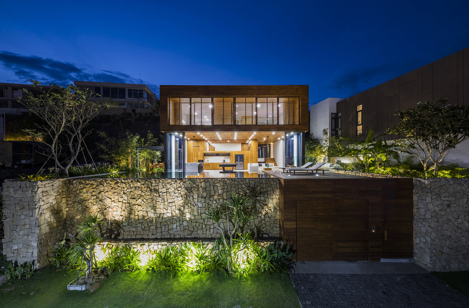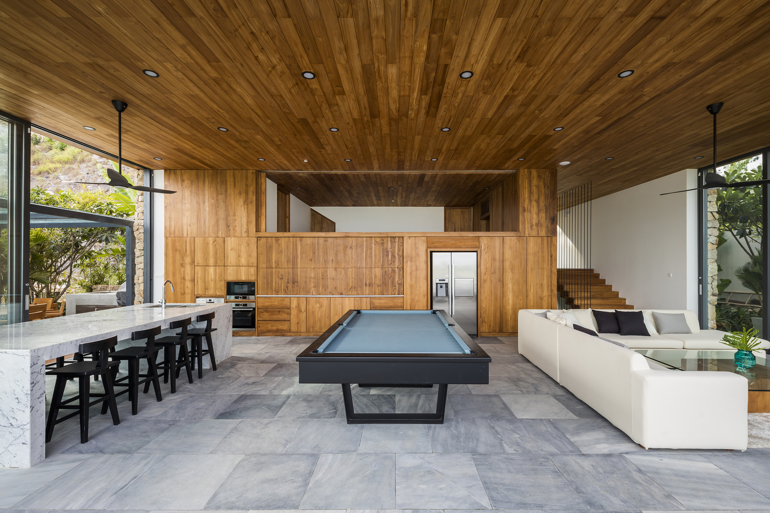Xét đến đặc điểm của khu đất với vách đá phía sau và mặt đường thấp hơn, công trình được bố trí trải dài theo chiều dọc, trên nhiều tầng. Ở tầng trệt, có gara và một phòng chiếu phim gia đình lớn phía sau hồ bơi với cửa sổ dưới nước đón ánh sáng mặt trời tự nhiên xuyên qua hồ bơi, các không gian kỹ thuật và spa ở phía sau. Ở tầng trung gian, hướng ra vách đá, là một phòng ngủ sang trọng với khu vườn riêng và phòng tắm ngoài trời. Tầng trệt là không gian chính, nơi đảo bếp, nhà bếp và phòng khách được kết hợp thành một không gian duy nhất, kết nối liền mạch với không gian ngoài trời. Trần nhà cao cho phép bố trí thêm một tầng lửng, được chuyển đổi thành một phòng ngủ sang trọng với tầm nhìn toàn cảnh ra nhà bếp. Khối nhà bằng gỗ là tầng một với 2 phòng ngủ sang trọng.