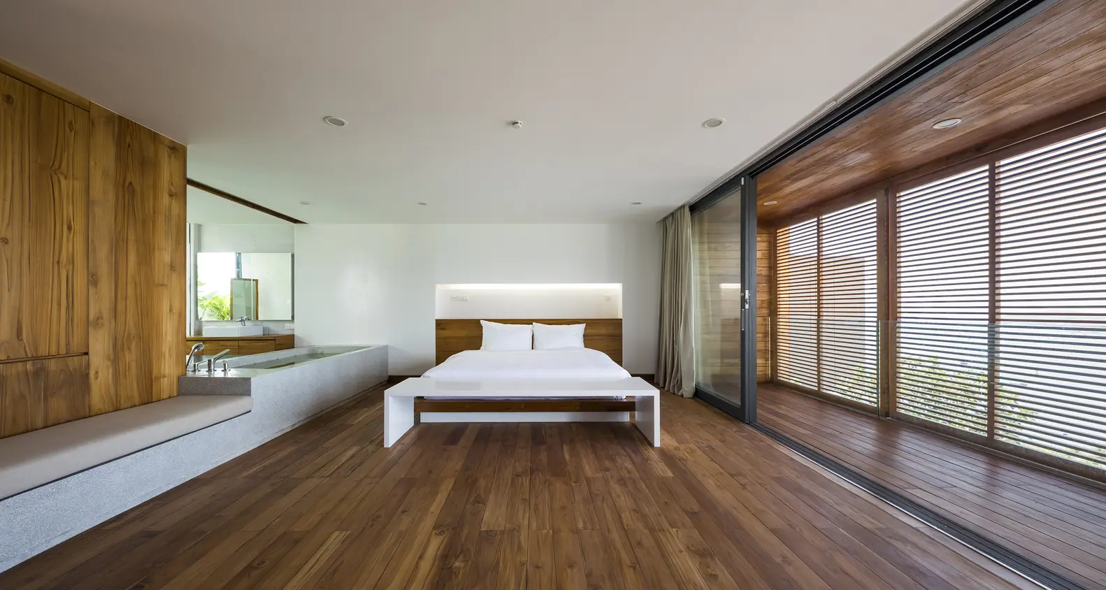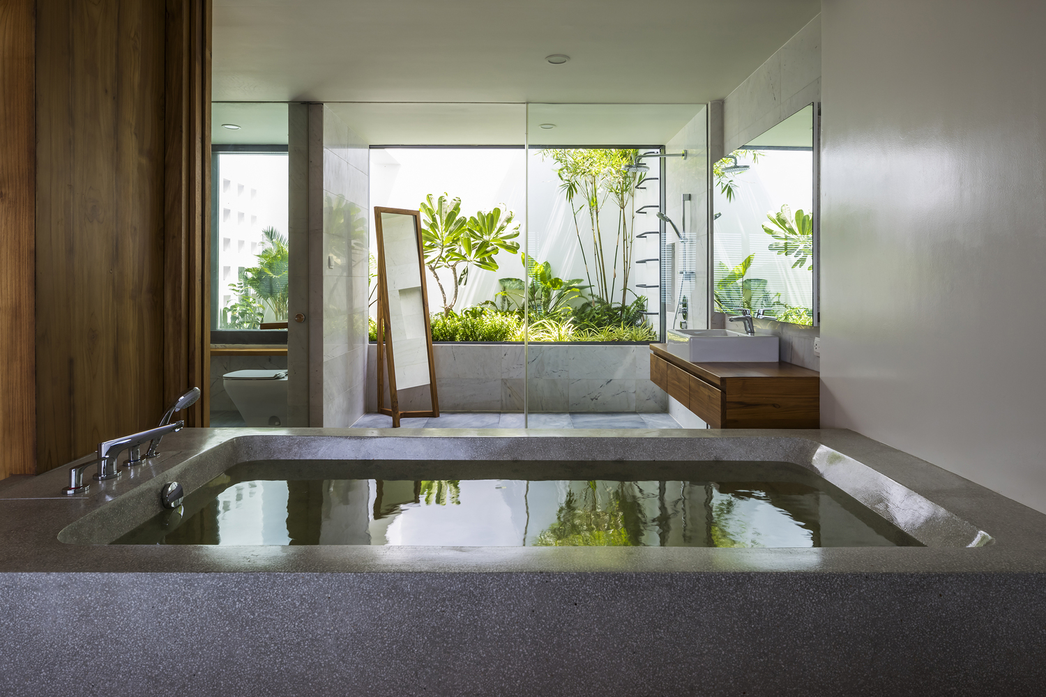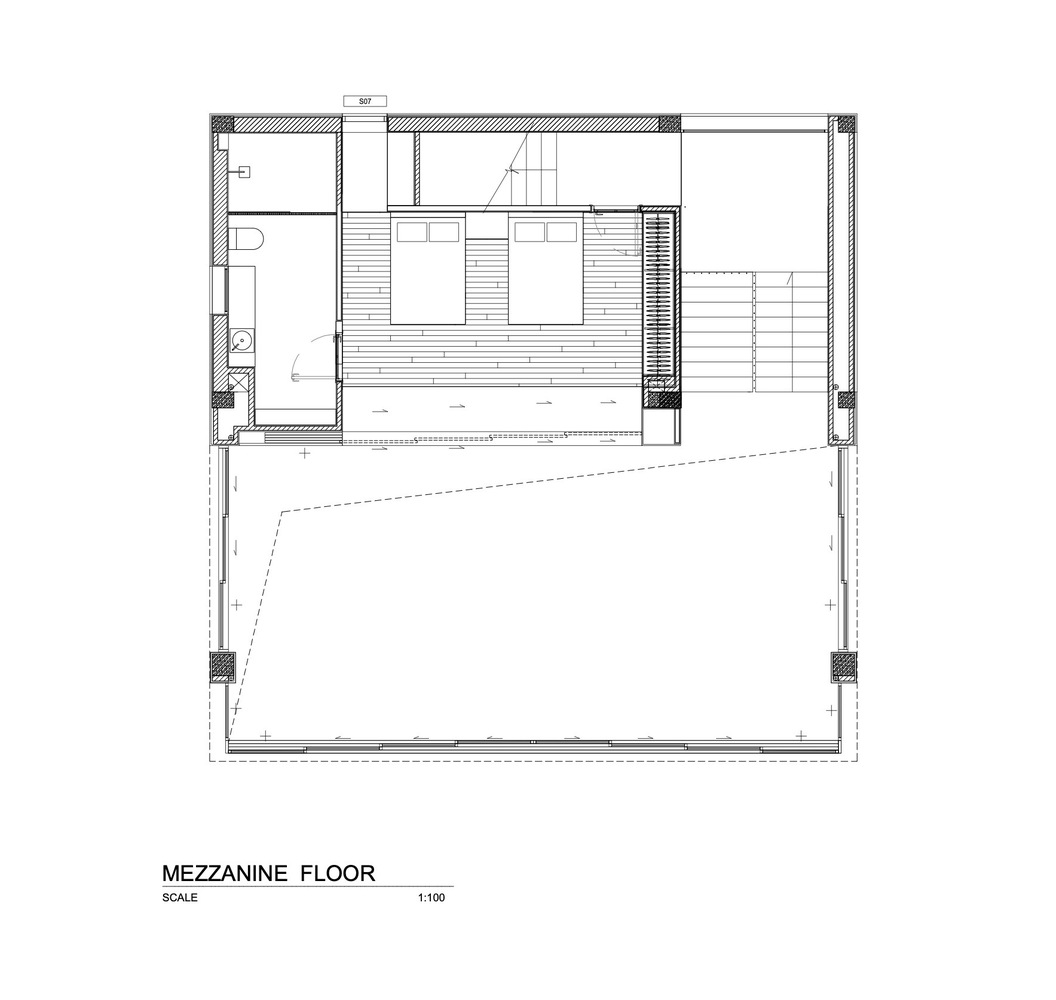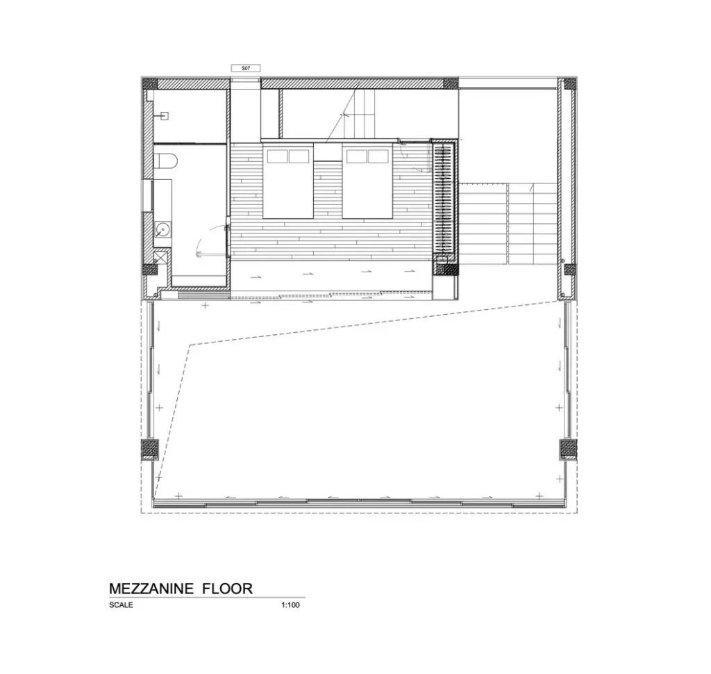 Xét đến đặc điểm của khu đất với vách đá phía sau và mặt đường thấp hơn, công trình được bố trí trải dài theo chiều dọc, trên nhiều tầng. Ở tầng trệt, có gara và một phòng chiếu phim gia đình lớn phía sau hồ bơi với cửa sổ dưới nước đón ánh sáng mặt trời tự nhiên xuyên qua hồ bơi, các không gian kỹ thuật và spa ở phía sau. Ở tầng trung gian, hướng ra vách đá, là một phòng ngủ sang trọng với khu vườn riêng và phòng tắm ngoài trời. Tầng trệt là không gian chính, nơi đảo bếp, nhà bếp và phòng khách được kết hợp thành một không gian duy nhất, kết nối liền mạch với không gian ngoài trời. Trần nhà cao cho phép bố trí thêm một tầng lửng, được chuyển đổi thành một phòng ngủ sang trọng với tầm nhìn toàn cảnh ra nhà bếp. Khối nhà bằng gỗ là tầng một với 2 phòng ngủ sang trọng.