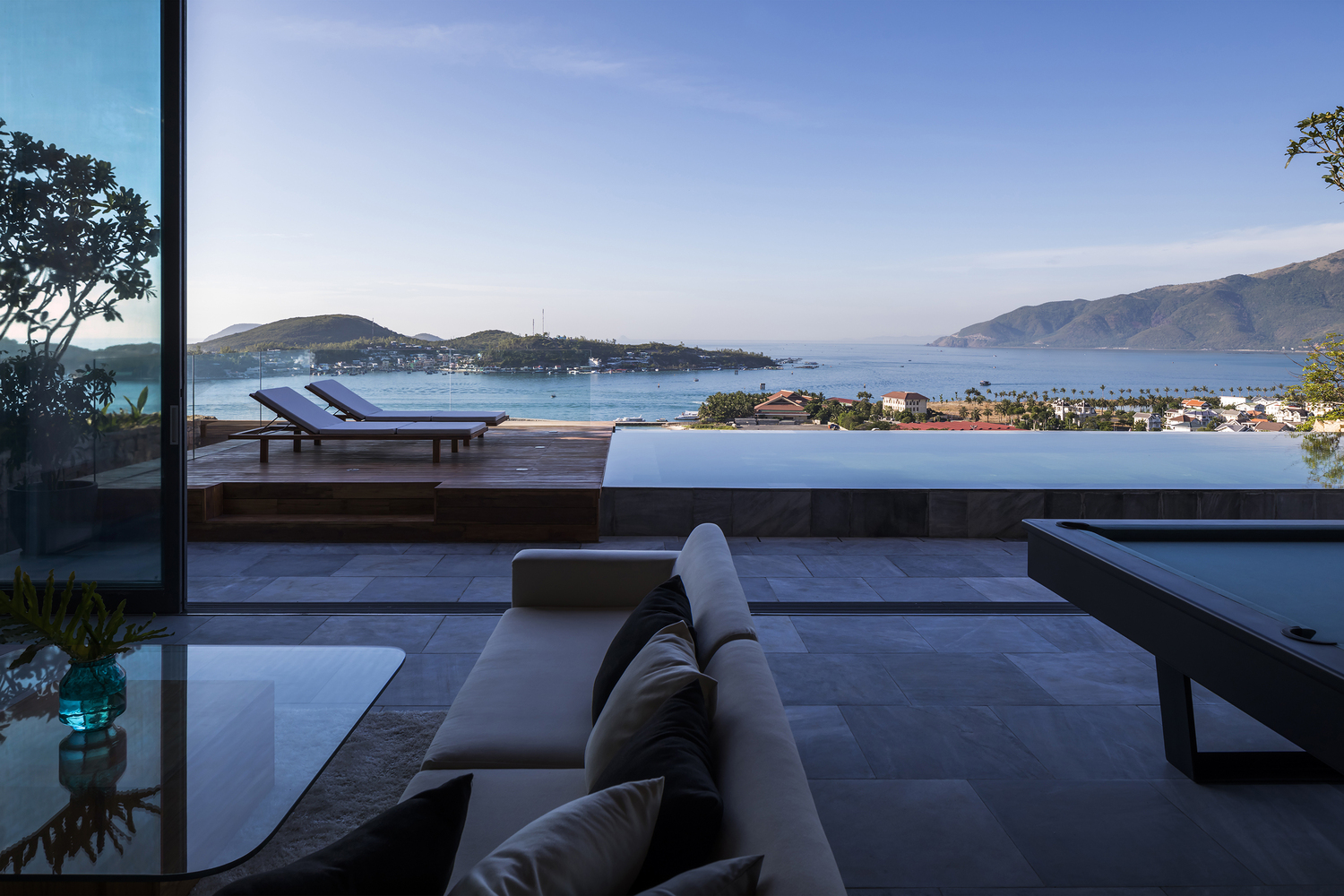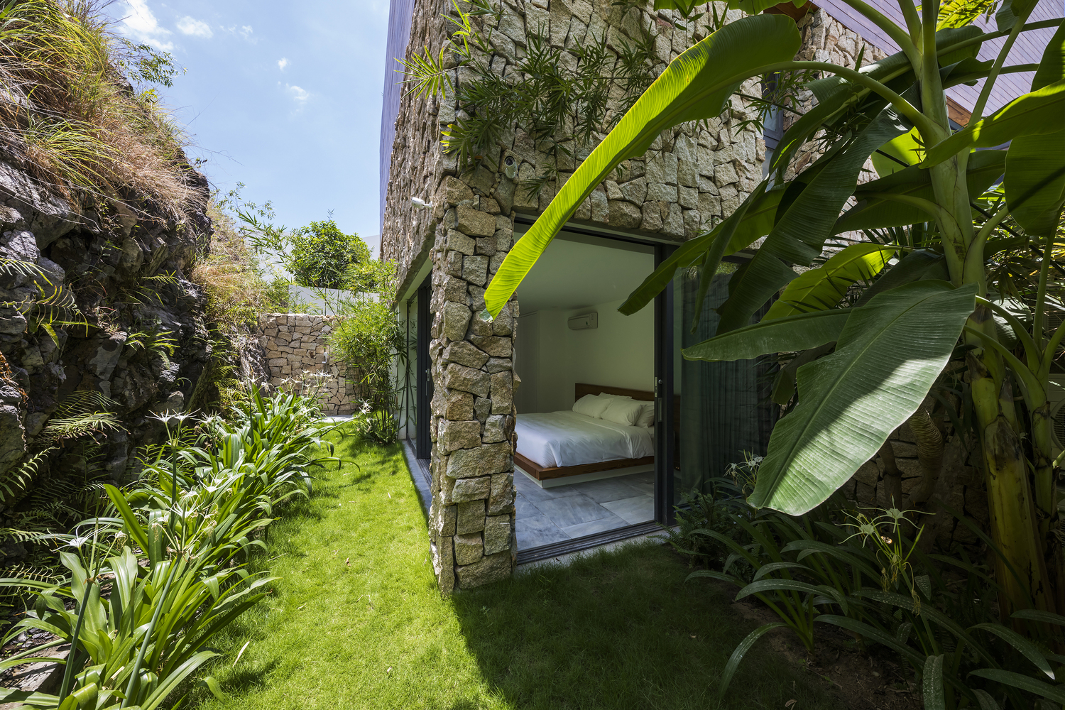 Mô tả bằng văn bản do các kiến trúc sư cung cấp. Tọa lạc tại Nha Trang, một thành phố biển thuộc bờ biển phía Đông Nam Việt Nam, khu nhà ở này là 1 trong 3 biệt thự nghỉ dưỡng (nhà đá, nhà gỗ và nhà kính) với vị trí vô cùng đắc địa. Được xây dựng trên sườn đồi, khu đất rộng 420m² sở hữu tầm nhìn biển độc đáo, hướng ra vịnh và dãy núi phía xa. Tuy nhiên, mật độ xây dựng cao của con phố sẽ ảnh hưởng đến tầm nhìn biển trong tương lai nếu không được lường trước. Mục tiêu thiết kế chính là tìm ra giải pháp ngay từ giai đoạn đầu để tối ưu hóa trải nghiệm ngắm cảnh và quản lý mật độ xây dựng cao của khu dân cư này trong tương lai, phù hợp với quy hoạch đô thị địa phương.