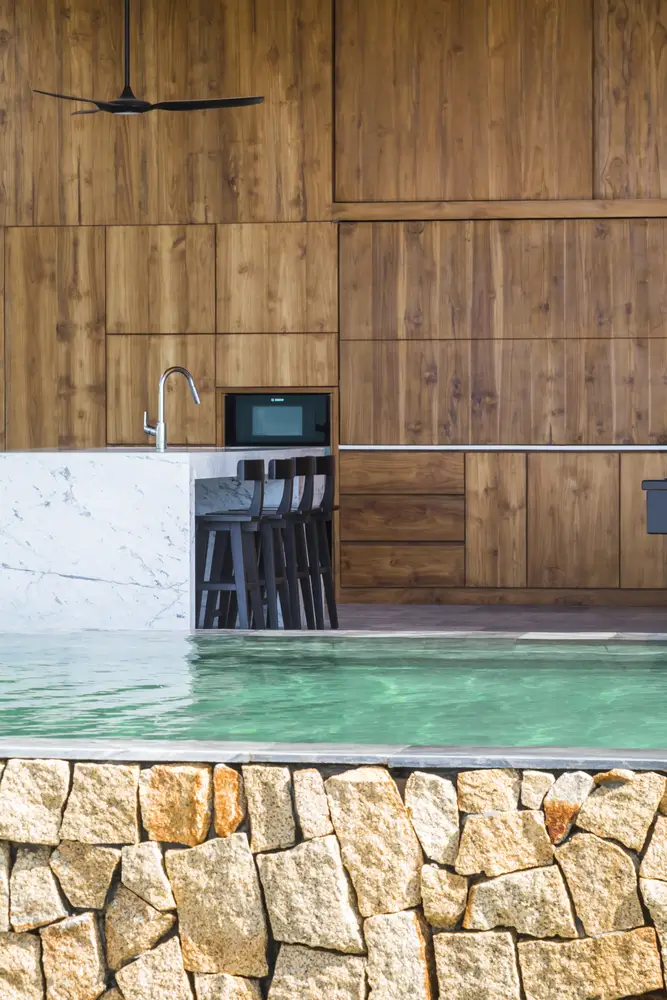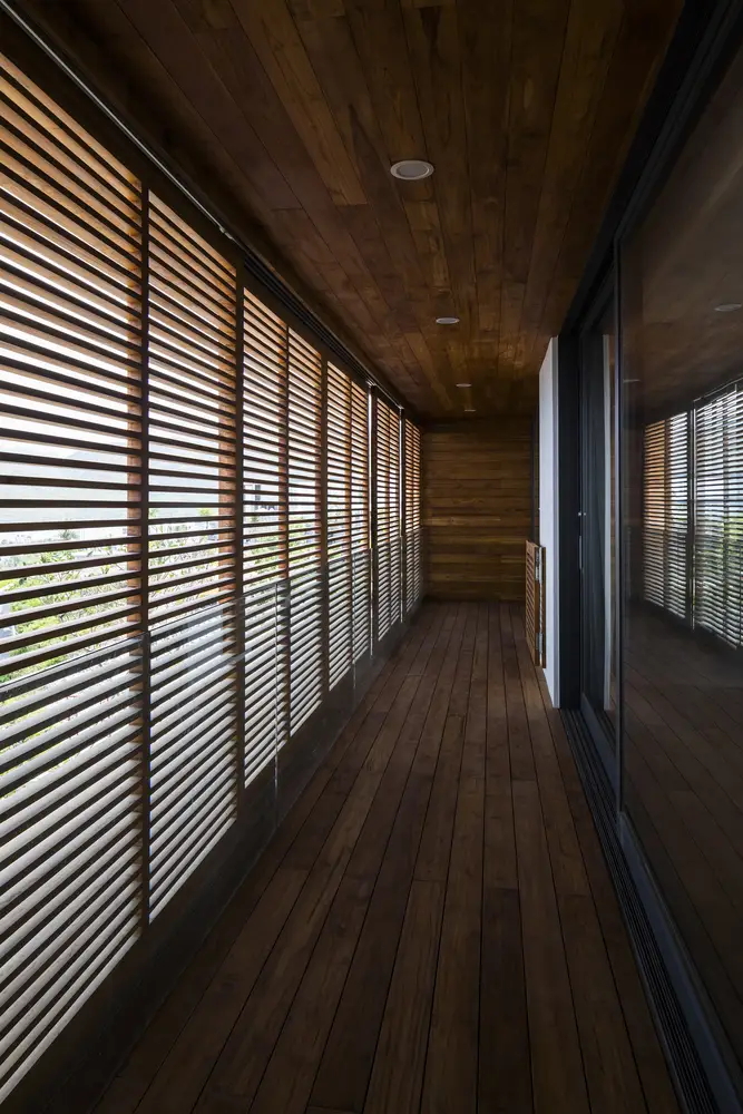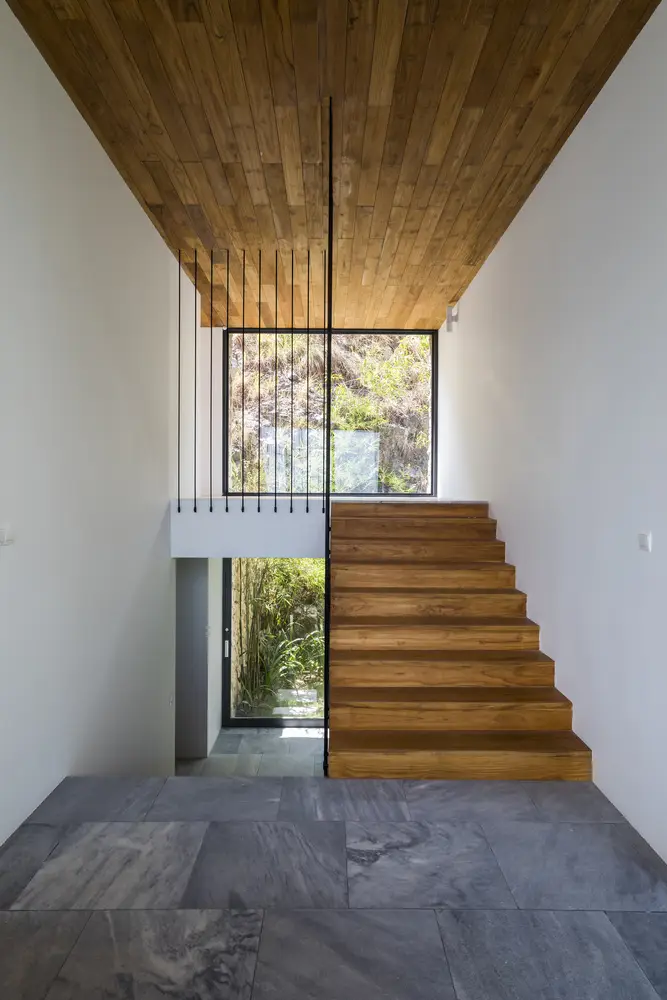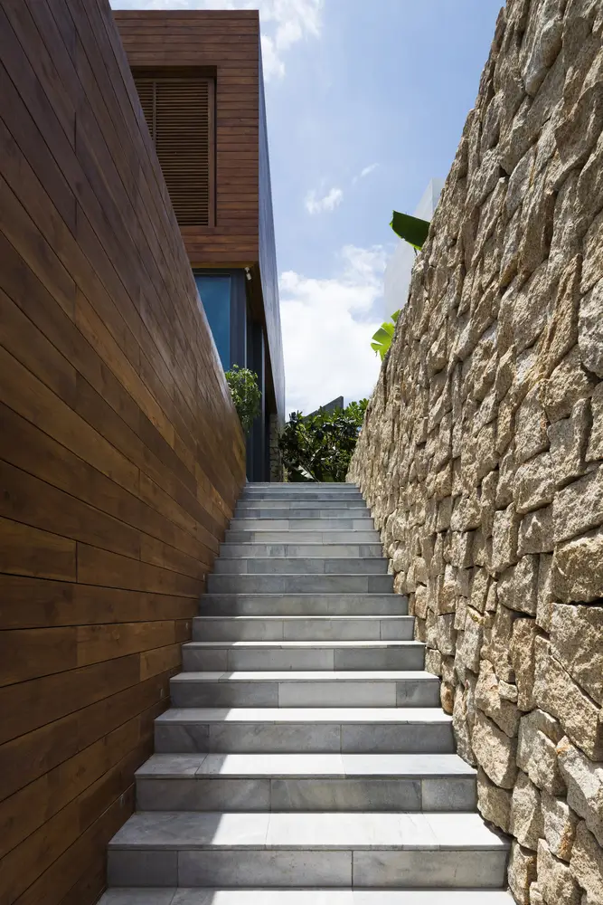 Những khối đá khai thác tại địa phương kết nối công trình với môi trường đá xung quanh, và lớp ốp gỗ tếch làm tăng hiệu ứng “lơ lửng” bằng cách bao bọc toàn bộ khối nhà tầng một. Sự kết hợp vật liệu này mang lại cảm nhận hiệu quả về các khối kiến trúc.