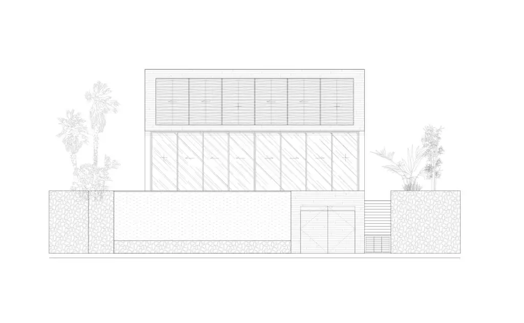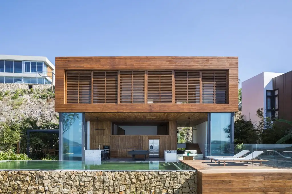 Ngôi nhà được xây trên một bệ lớn để có đủ độ cao, giúp quan sát được tầm nhìn ra biển, đường phố và các khu nhà phía trước. Bể bơi là một khối nhô ra thêm, cao hơn mặt sàn với 3 mặt tràn. Nó tạo ra sự kết nối trực tiếp về mặt thị giác với cảnh biển và giảm thiểu tác động thị giác từ môi trường xung quanh. Ngôi nhà được cấu tạo bởi 2 yếu tố chính: Một khối trần rất cao, mặt trước được ốp kính, mặt sau ốp đá, mở rộng ra sân hiên, hướng ra biển và đồi núi, và một khối hộp bằng gỗ, được treo lơ lửng, với các lam chắn lớn có thể mở ra.