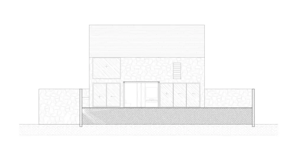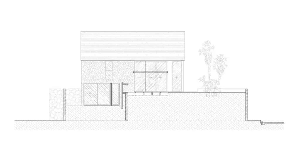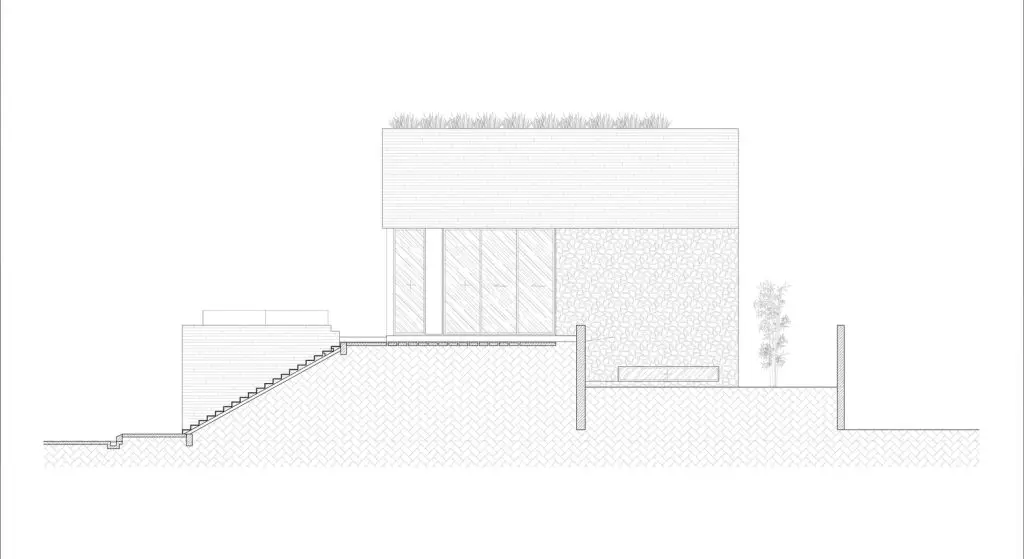 Xét từ góc độ cho thuê nghỉ dưỡng, mục tiêu là tối đa hóa khả năng đón tiếp và trải nghiệm giải trí. Ngôi nhà có lối vào từ đường chính với cầu thang ngoài trời dẫn lên tầng thượng.