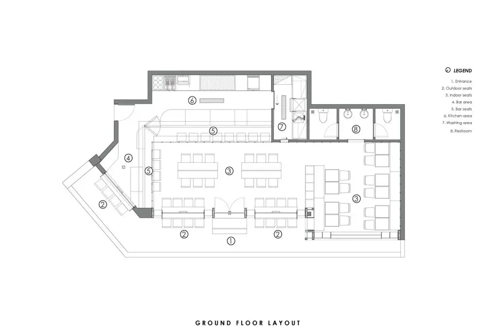 Cách bố trí chia không gian thành hai khu vực. Khu vực trung tâm chính là nơi tập trung các cuộc trò chuyện và tương tác sôi nổi, còn khu vực ăn uống phù hợp hơn cho những bữa tối yên tĩnh cùng gia đình. Mặt tiền nổi bật trên một con phố có những tòa nhà thấp, tạo nên điểm nhấn thu hút người đi đường bước vào và lấp đầy không gian bằng niềm vui.