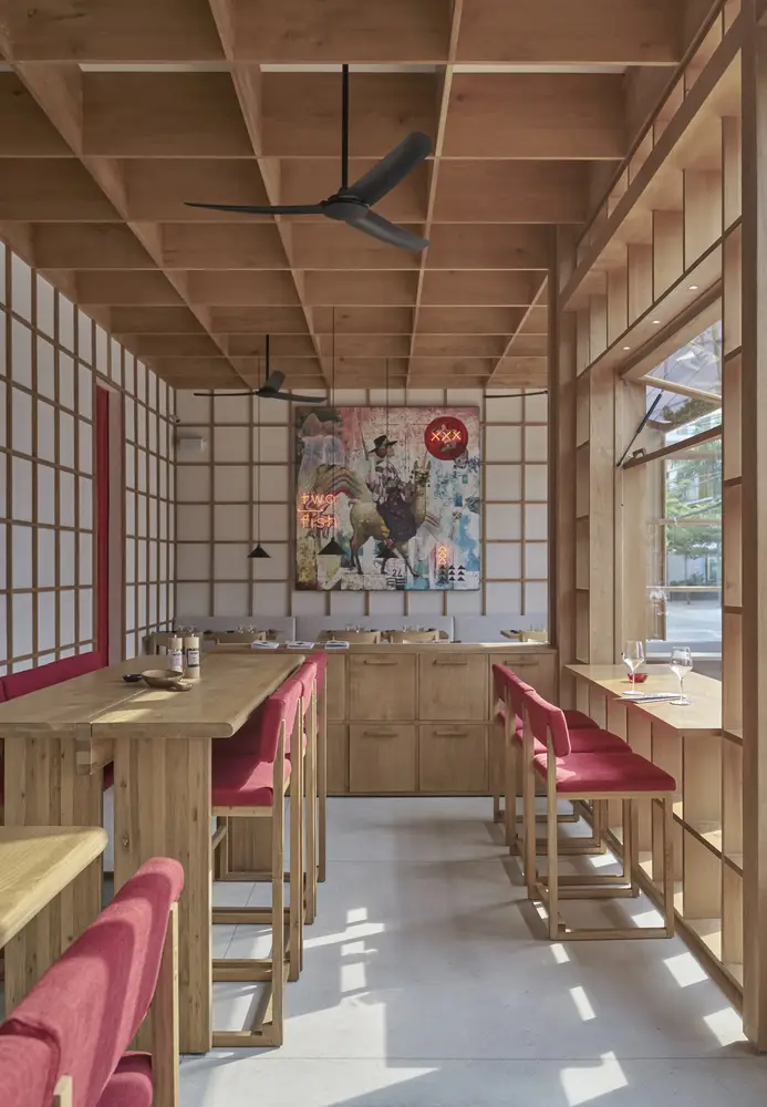 Bản sắc ẩm thực tại Tinto là yếu tố chính định hình thiết kế. Ánh sáng đỏ rực rỡ, gợi nhớ đến những cánh đồng sắc tố dọc dãy núi Andes, và các vật liệu bán trong suốt mô phỏng cửa trượt kiểu Nhật (Shoji). Không gian mở ra hướng ra đường phố, chào đón những vị khách mới và thúc đẩy sự tương tác giữa khách hàng và người qua đường. Những ô cửa sổ lớn chính có thể gập lên tạo thành mái che giúp bảo vệ bàn khỏi mưa, và những chiếc ghế đẩu bên trong là nơi lý tưởng để thưởng thức một ly bia Nhật mát lạnh sau giờ làm việc.