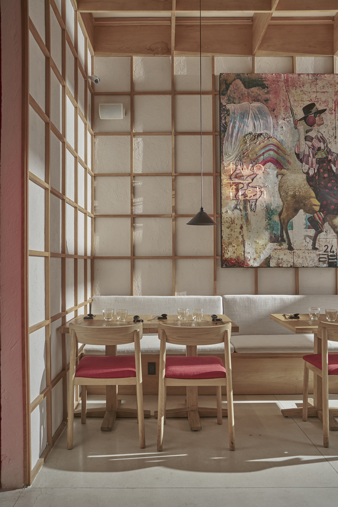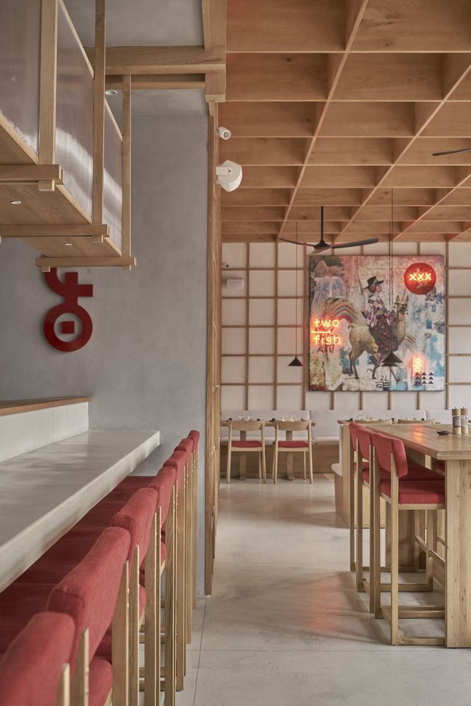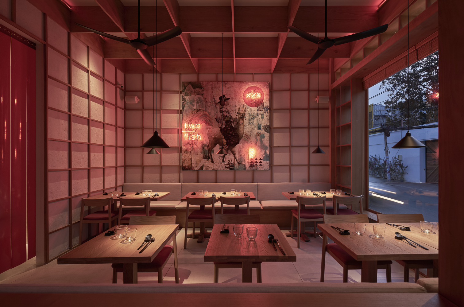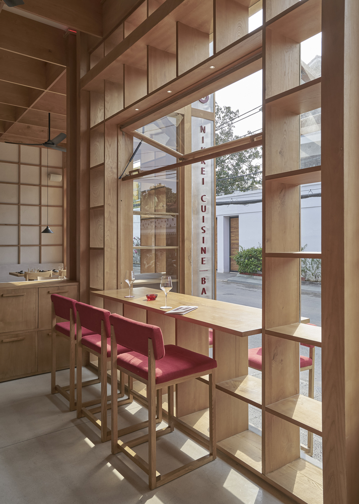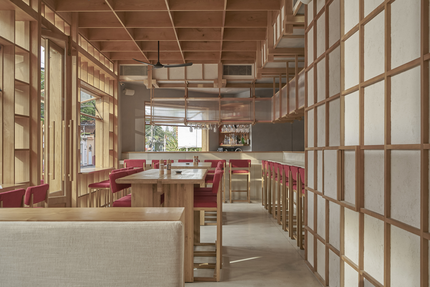 Bản sắc ẩm thực tại Tinto là yếu tố chính định hình thiết kế. Ánh sáng đỏ rực rỡ, gợi nhớ đến những cánh đồng sắc tố dọc dãy núi Andes, và các vật liệu bán trong suốt mô phỏng cửa trượt kiểu Nhật (Shoji). Không gian mở ra hướng ra đường phố, chào đón những vị khách mới và thúc đẩy sự tương tác giữa khách hàng và người qua đường. Những ô cửa sổ lớn chính có thể gập lên tạo thành mái che giúp bảo vệ bàn khỏi mưa, và những chiếc ghế đẩu bên trong là nơi lý tưởng để thưởng thức một ly bia Nhật mát lạnh sau giờ làm việc.