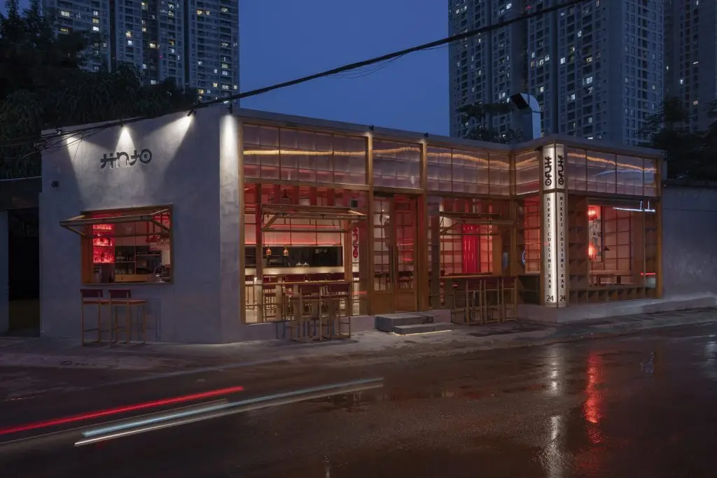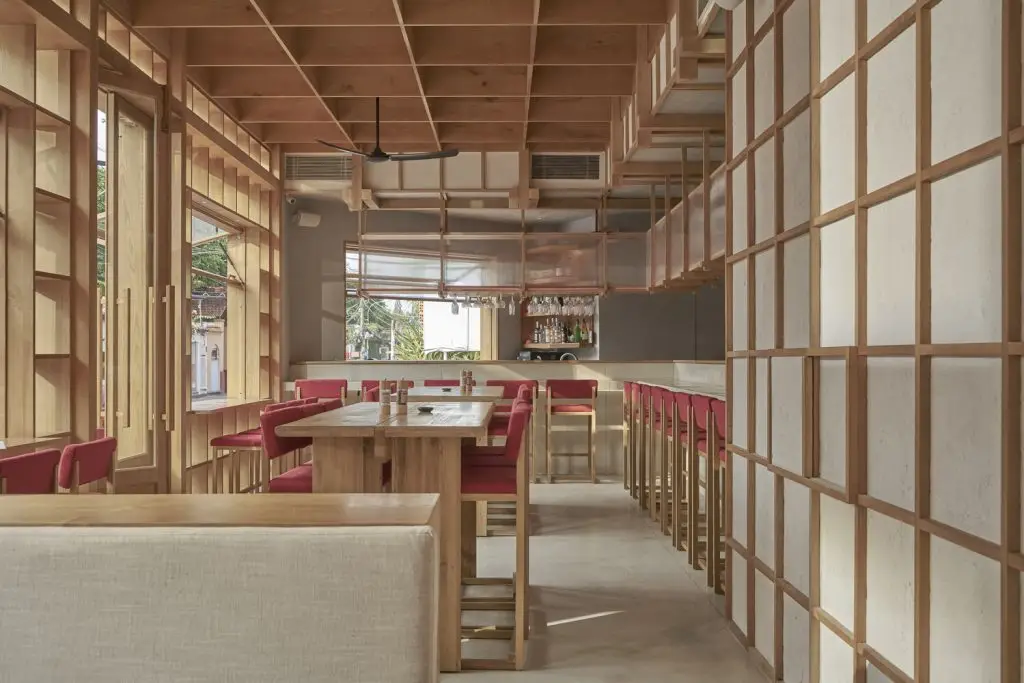 Cách bố trí chia không gian thành hai khu vực. Khu vực trung tâm chính là nơi tập trung các cuộc trò chuyện và tương tác sôi nổi, còn khu vực ăn uống phù hợp hơn cho những bữa tối yên tĩnh cùng gia đình. Mặt tiền nổi bật trên một con phố có những tòa nhà thấp, tạo nên điểm nhấn thu hút người đi đường bước vào và lấp đầy không gian bằng niềm vui.
