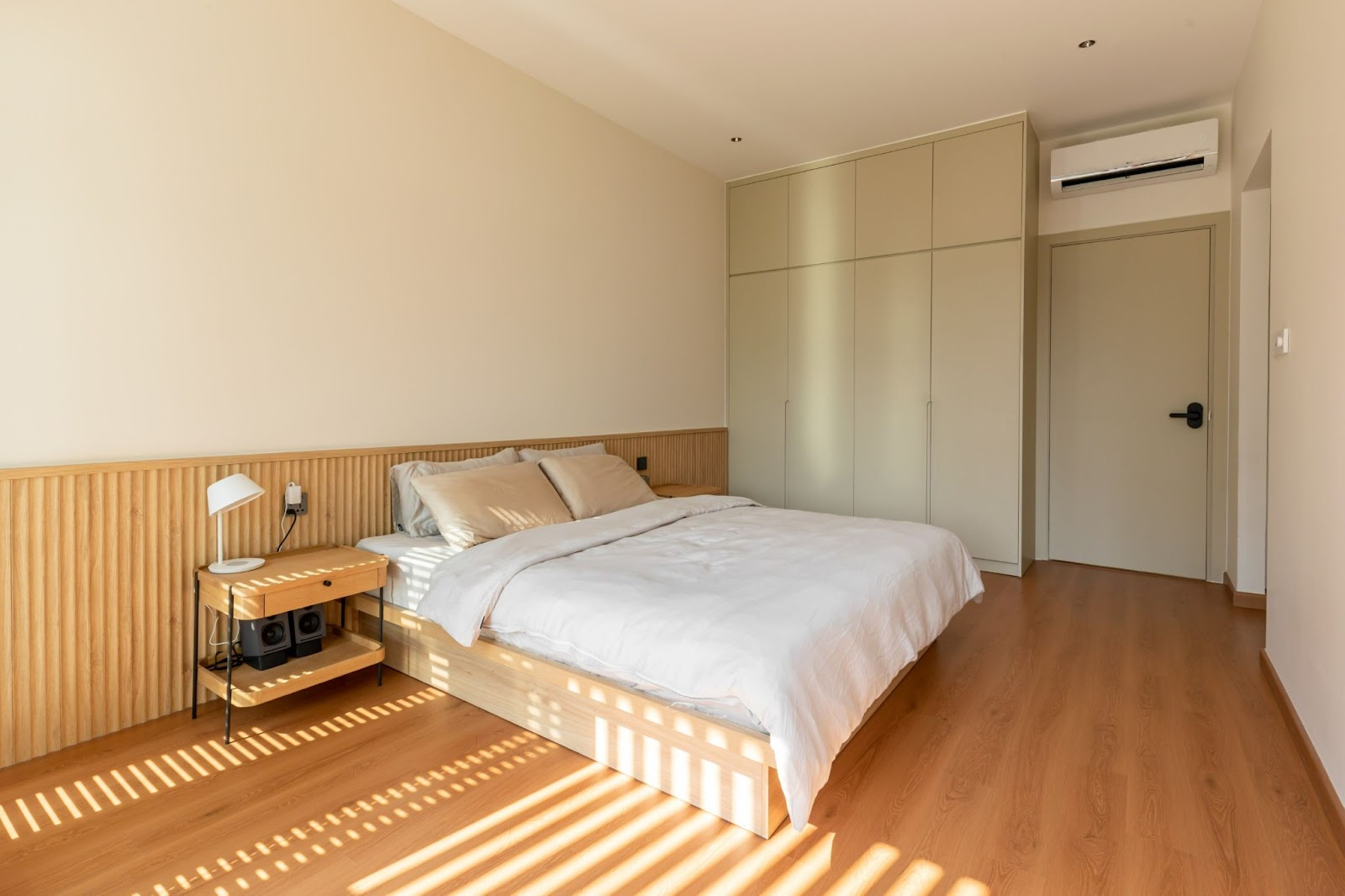 Phòng ngủ tối giản với tông màu be, gỗ tạo cảm giác thông thoáng