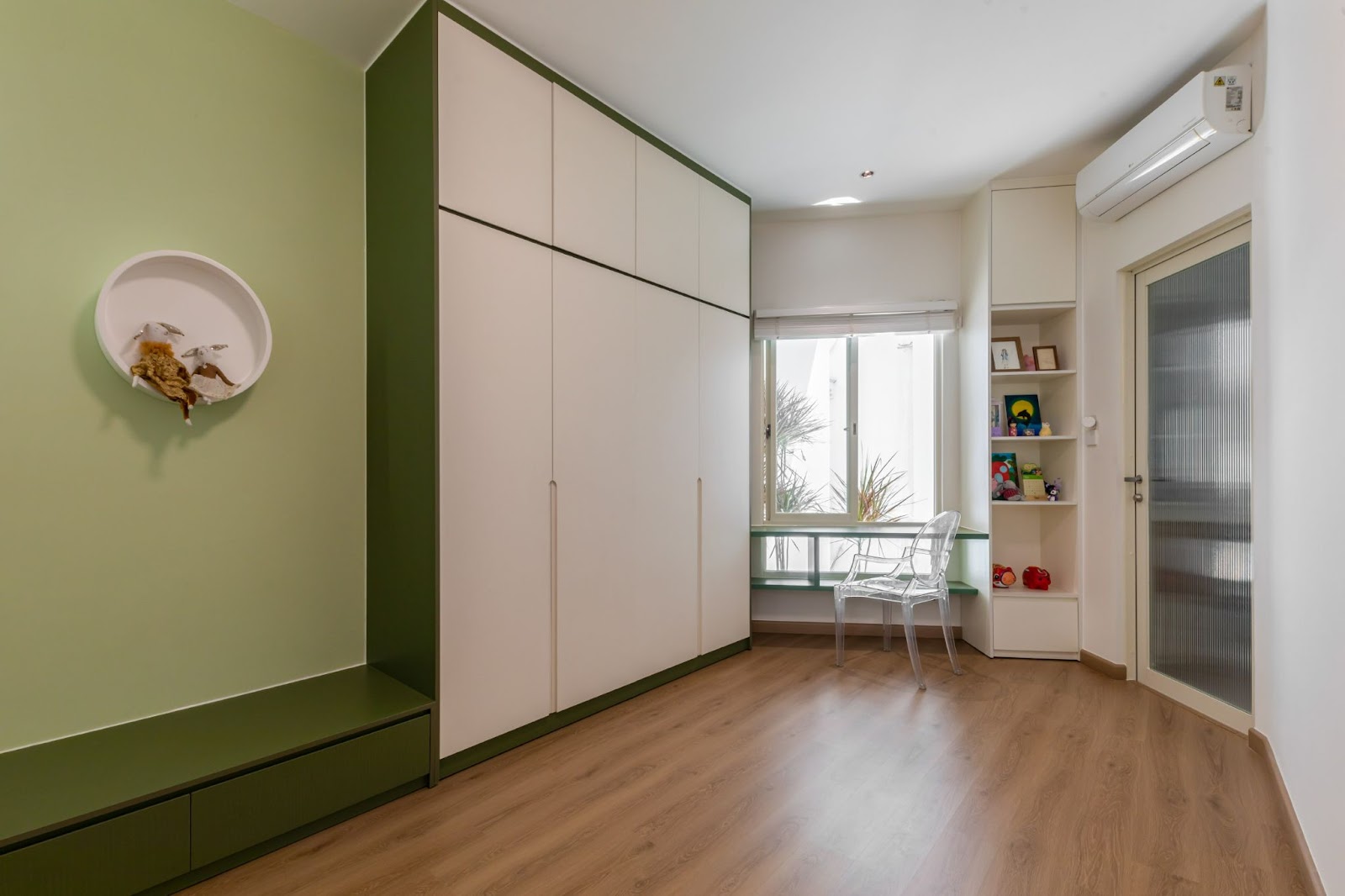 Phòng ngủ cho con của gia chủ, bàn học ngay cửa kính lớn tối ưu ánh sáng