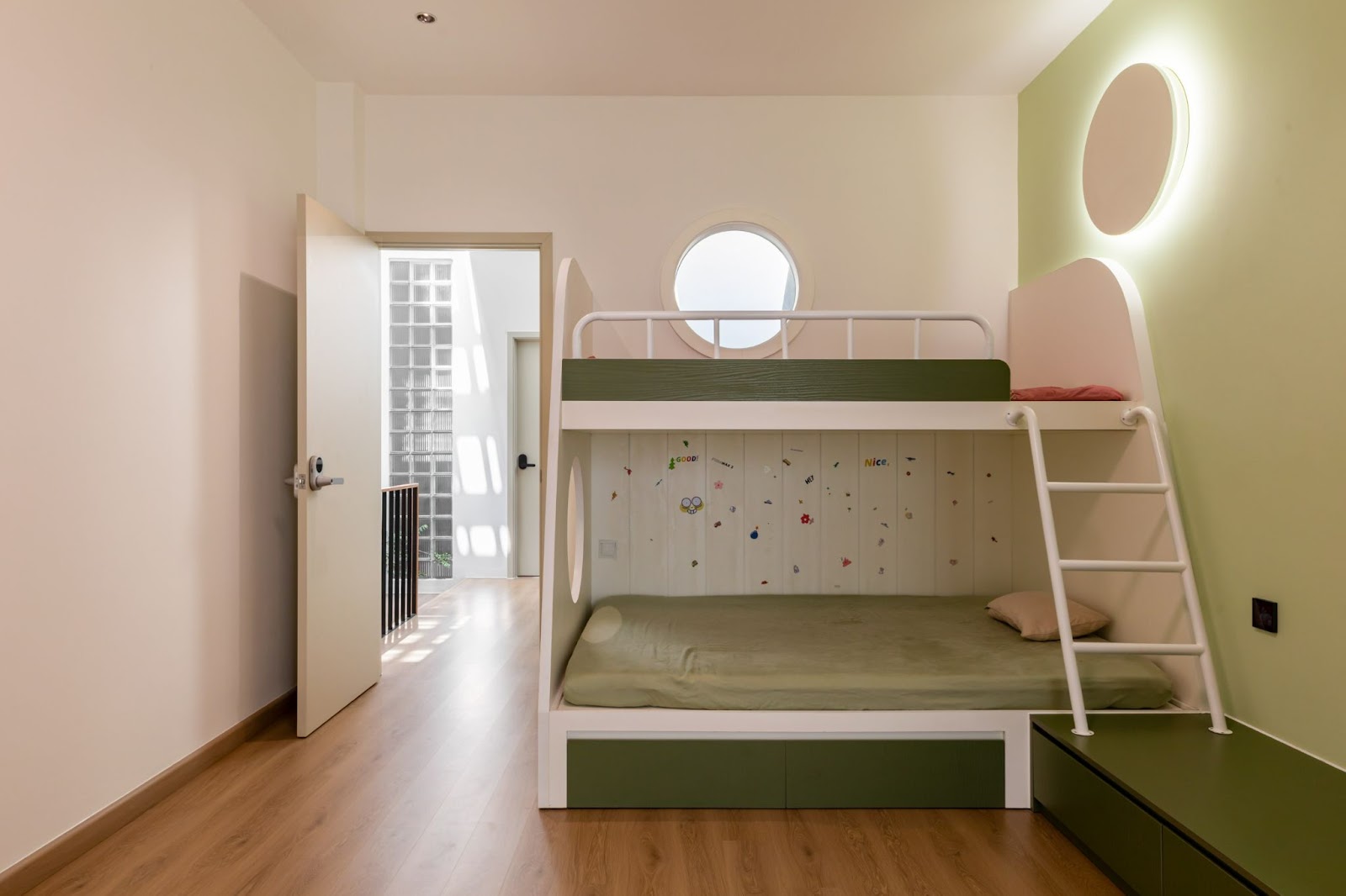 Giường tầng với tông màu xanh hài hòa với cả căn phòngNgôi nhà theo đuổi phong cách tối giản, với tông màu be nhẹ nhàng làm chủ đạo, kết hợp điểm nhấn màu đen của khối cầu thang và màu gỗ ấm của lam trang trí. Tổng thể công trình mang đến cảm giác thanh lịch, thoáng đãng mà vẫn giữ được vẻ sang trọng và hiện đại.