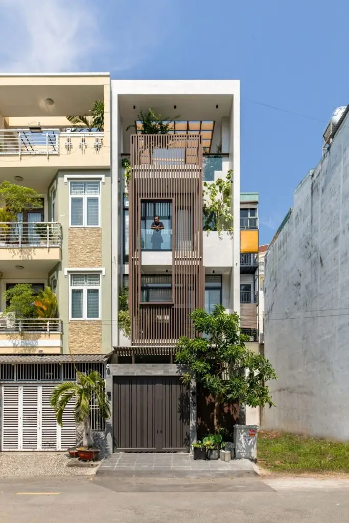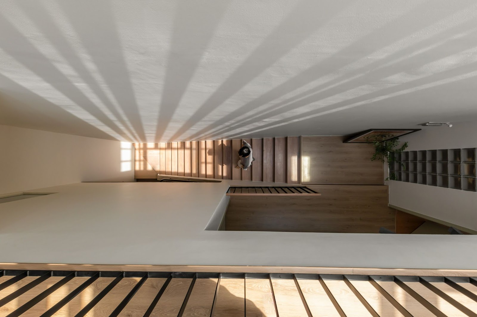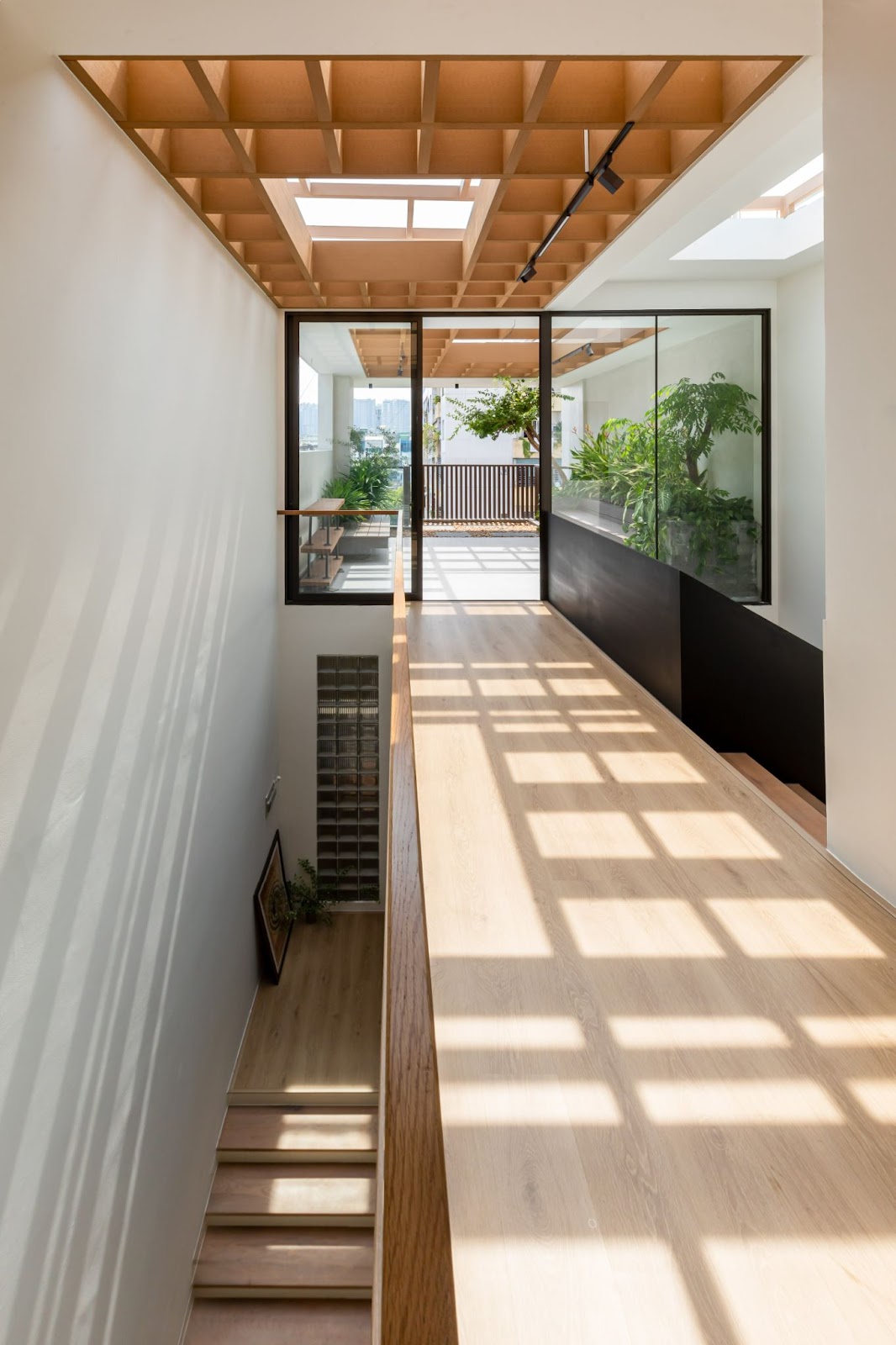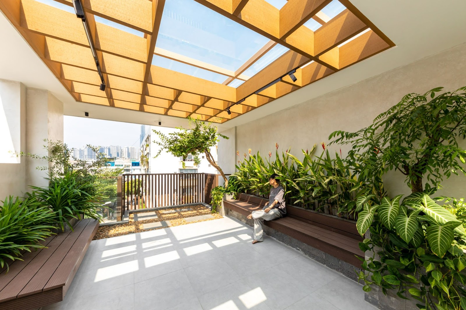 Thiết kế cầu thang linh hoạt theo không gian từng tầngTrong bối cảnh khoảng sân trước được ưu tiên cho chức năng văn phòng, sân thượng đóng vai trò như “lá phổi” xanh và là không gian thư giãn trung tâm cho khối nhà ở. Sân thượng được thiết kế với nhiều mảng xanh, sàn rải sỏi, bục ngồi bằng gỗ, kết hợp với hệ lam nhựa giả gỗ vừa tạo bóng mát, vừa làm dịu đi bức xạ nhiệt. Các ô trống với kích thước đa dạng trong hệ lam tạo nên những khung hình nghệ thuật, như những bức tranh mở ra bầu trời.