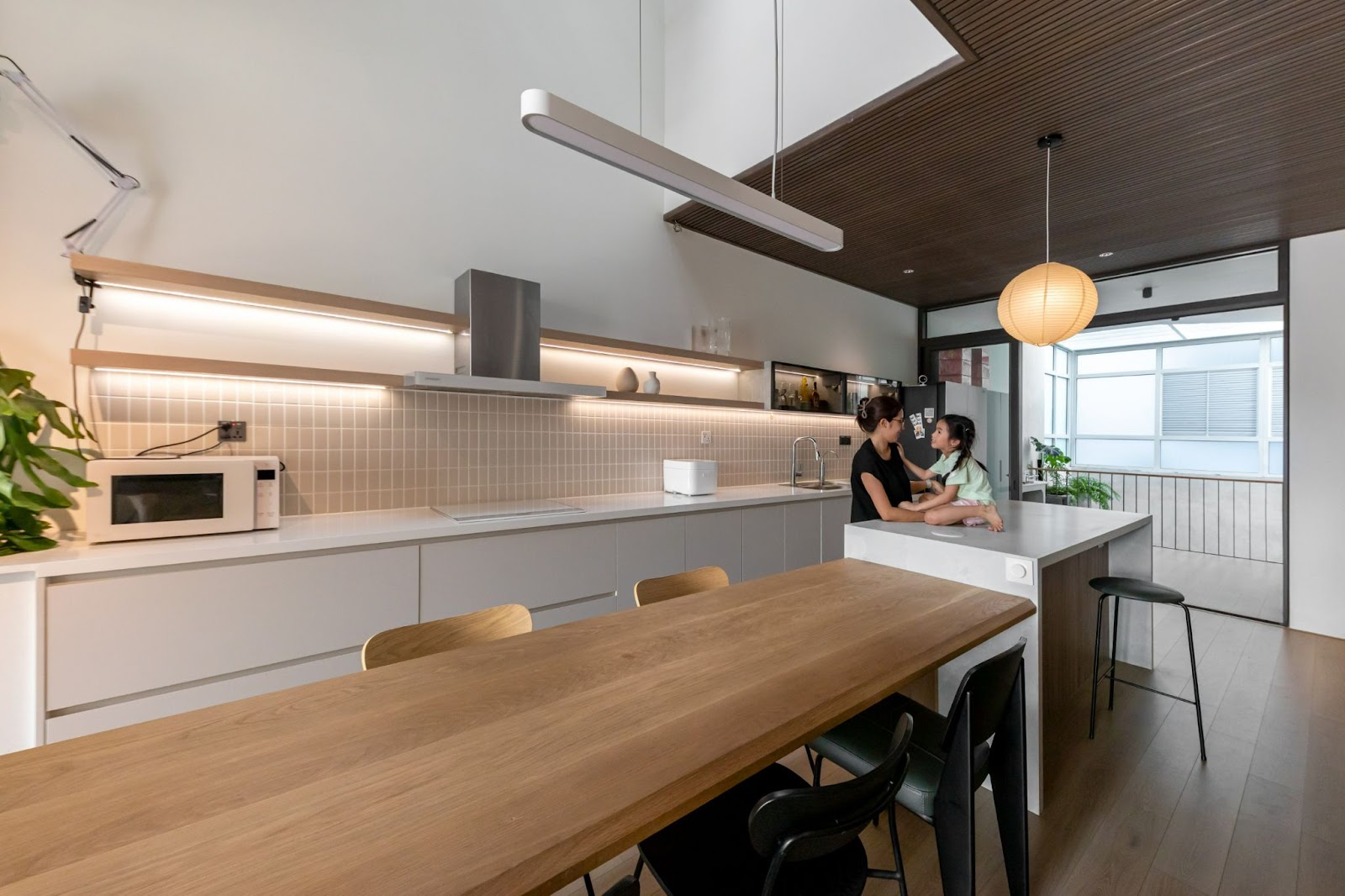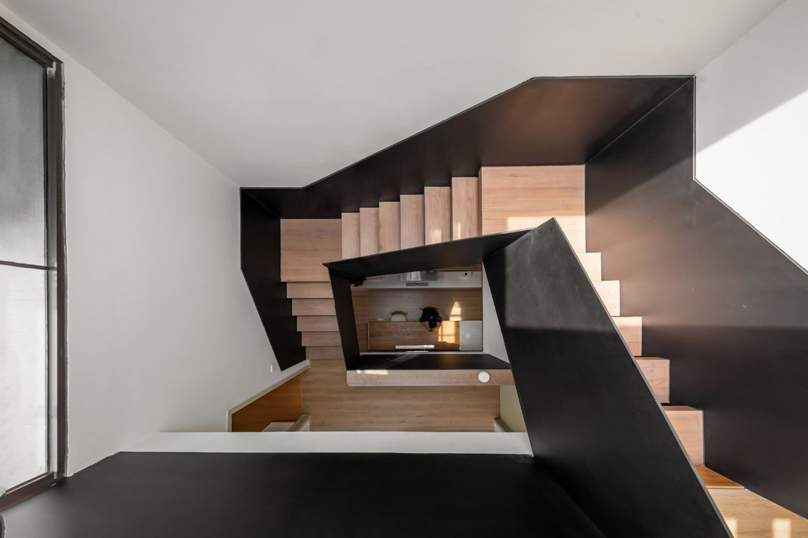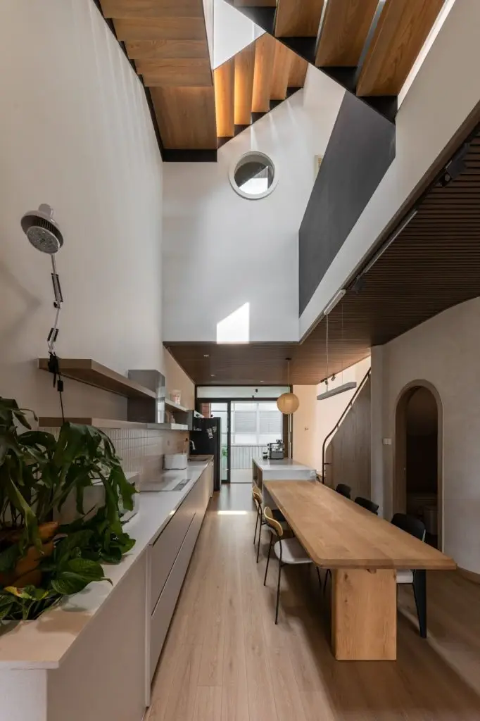 Khu vực bếp và phòng khách lưu thông với nhauTừ tầng hai trở lên, hệ cầu thang được đưa vào bên trong nhà nhằm tăng tính riêng tư và an ninh. Thiết kế cầu thang được linh hoạt theo công năng từng tầng: đoạn cầu thang từ tầng hai lên tầng ba là dạng thang thẳng, bắt đầu ngay từ sảnh vào, không làm ảnh hưởng đến sinh hoạt của không gian bếp và phòng khách. Đoạn cầu thang từ tầng ba lên sân thượng được bố trí ở trung tâm ngôi nhà, giúp hai phòng ngủ tiếp cận dễ dàng. Cầu thang kết hợp với giếng trời tạo nên nguồn sáng tự nhiên, góp phần thông thoáng cho khu vực bếp và đồng thời mở rộng tầm nhìn, kết nối giữa các tầng một cách mạch lạc.