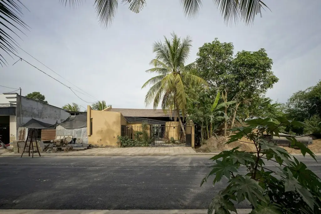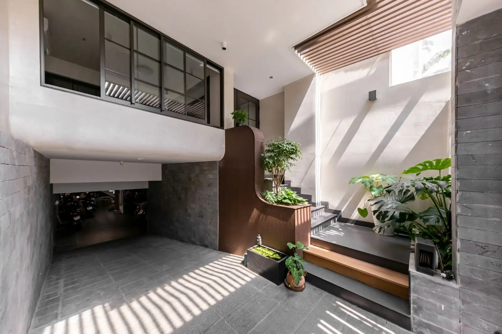 Mặt tiền Trầm Hương HouseVới mục tiêu tách biệt rõ ràng giữa không gian sống và không gian làm việc, công trình được tổ chức theo hai hướng tiếp cận riêng biệt. Khu văn phòng được tiếp cận thông qua lối tam cấp và sảnh chính phía trước, dẫn lên tầng một. Trong khi đó, khu nhà ở có lối đi riêng ở phía sau, dẫn xuống tầng bán hầm, nơi được bố trí hệ thống thang máy và thang bộ dẫn lên tầng hai. Việc bố trí hai lối đi độc lập giúp đảm bảo tính riêng tư cũng như sự thuận tiện cho cả hai chức năng.