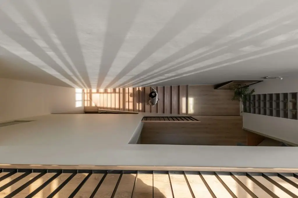 Khu văn phòng được tiếp cận thông qua lối tam cấp và sảnh chính phía trướcLối cầu thang từ tầng bán hầm lên tầng hai được thiết kế dừng lại ở một khu sảnh đệm trước khi vào nhà. Tại đây, một giếng trời được bố trí để lấy sáng và thông gió, tạo nên không gian đón chào thoáng đãng, mang lại cảm giác dễ chịu và tích cực cho gia chủ mỗi khi bước vào nhà. Hệ cầu thang bộ từ tầng 2 lên tầng 3 và sân thượng được chuyển vào bên trong nhà giúp ngôi nhà trở nên riêng tư và an ninh.