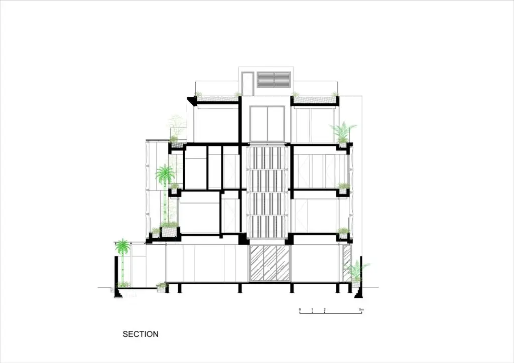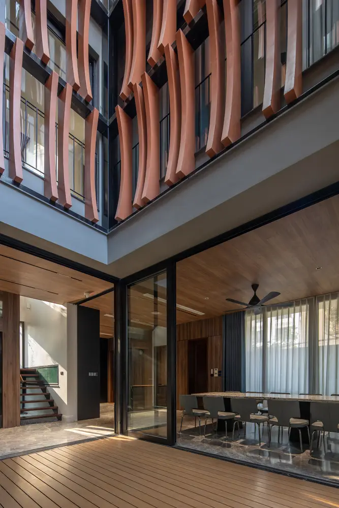 Các khoảng sân ở tầng 1 và không gian kết nối rất linh hoạt, được liên kết với nhau để tạo điều kiện cho luồng không khí lưu thông hài hòa, làm mát tất cả các không gian.