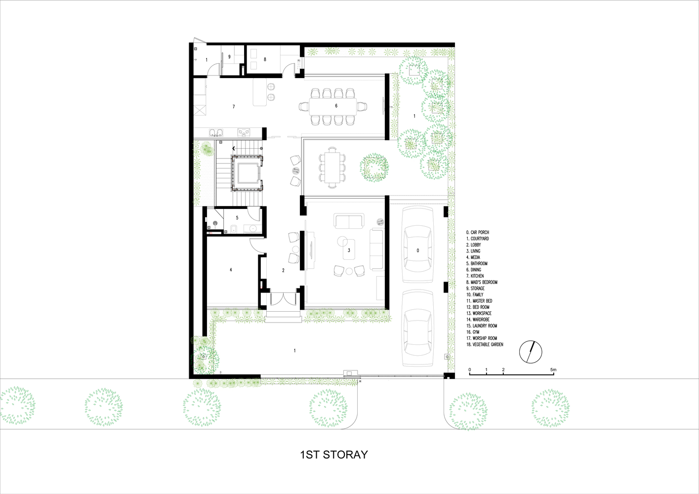 Ngôi nhà mang đậm triết lý nhiệt đới này lấy không gian xanh làm cốt lõi chính bao quanh toàn bộ ngôi nhà.