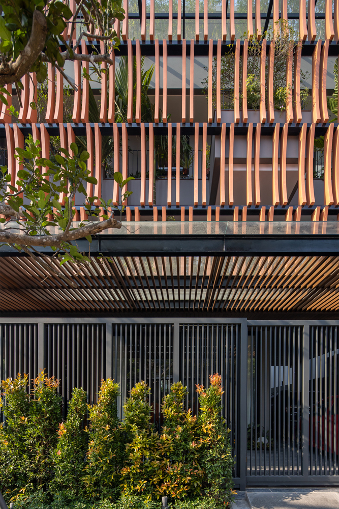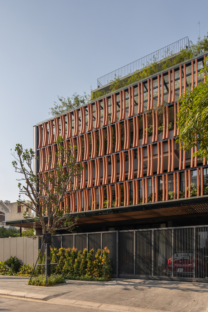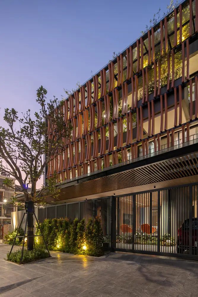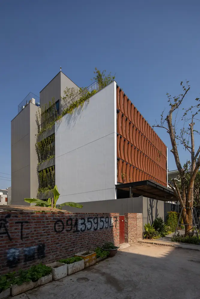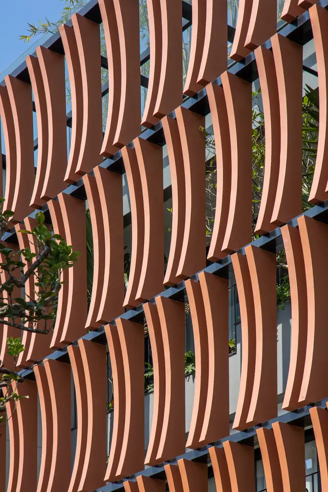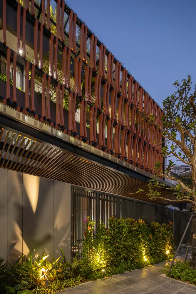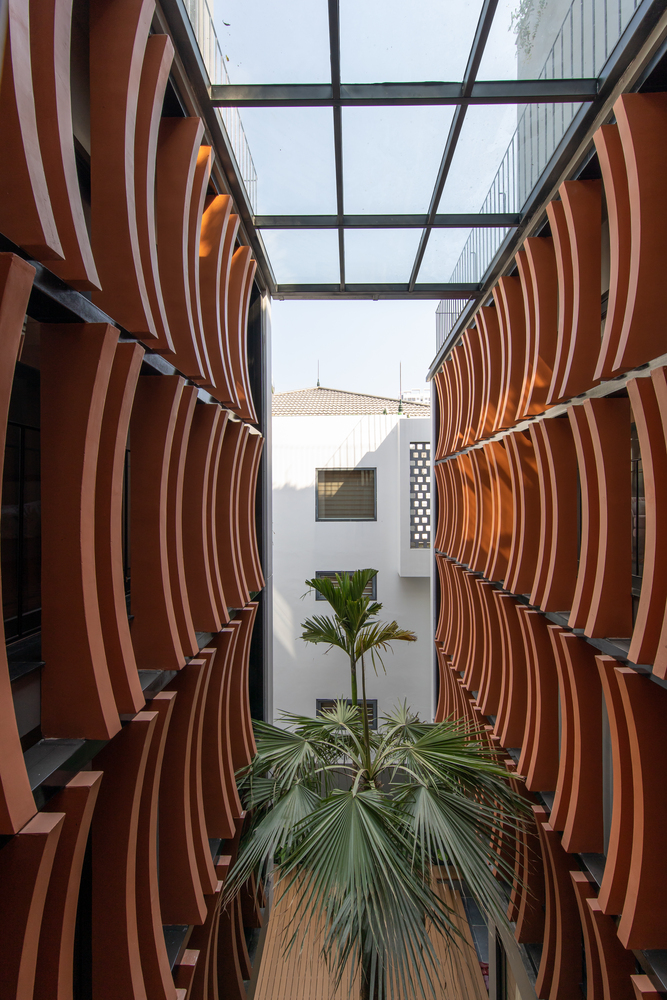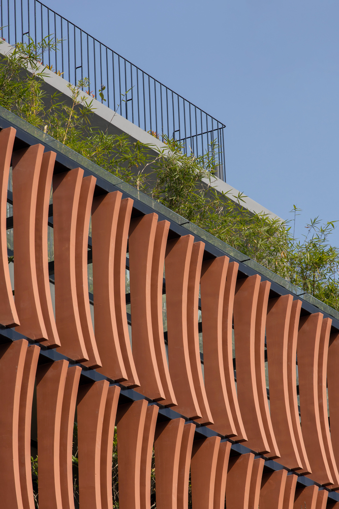 Mặt tiền kiến ​​trúc của tòa nhà tạo nên một lớp màu xanh lam gợi nhớ đến những ký ức truyền thống của người Việt Nam. Lớp kính này sẽ làm giảm cường độ ánh sáng mặt trời chiếu vào tòa nhà, đồng thời tăng thêm sự riêng tư cho các không gian sinh hoạt bên trong. Lớp vườn nằm giữa lớp màu xanh lam và các không gian sinh hoạt là một không gian trung gian giúp điều hòa vi khí hậu và làm nổi bật cảnh quan, tạo cảm giác thư thái cho tâm hồn con người.