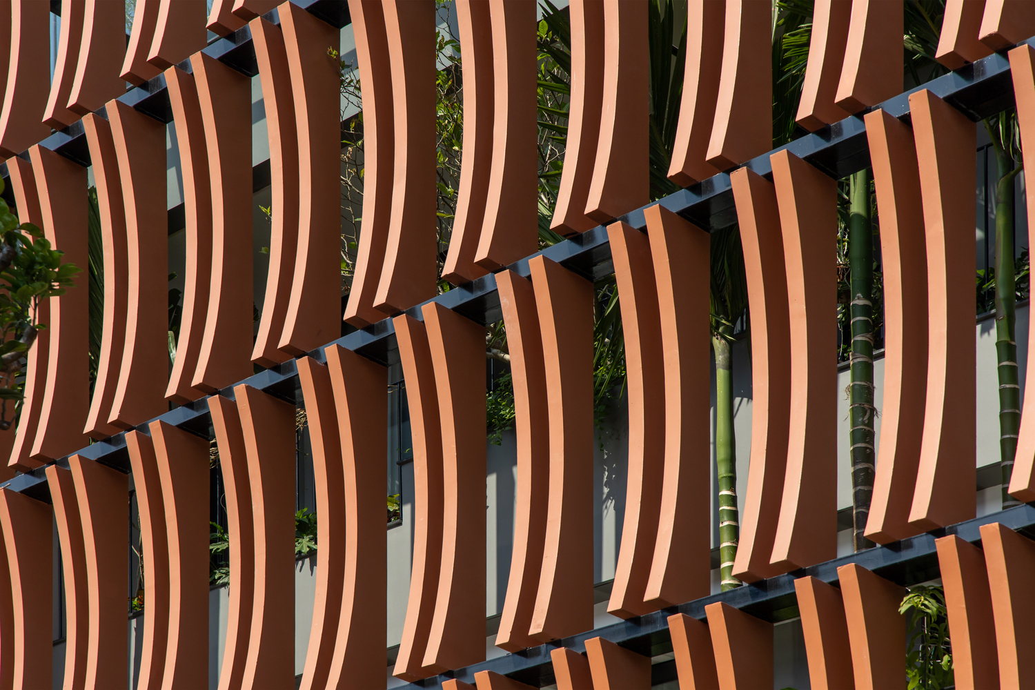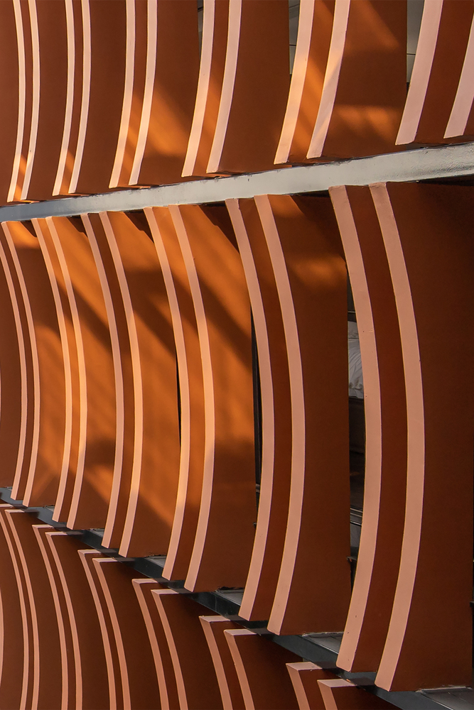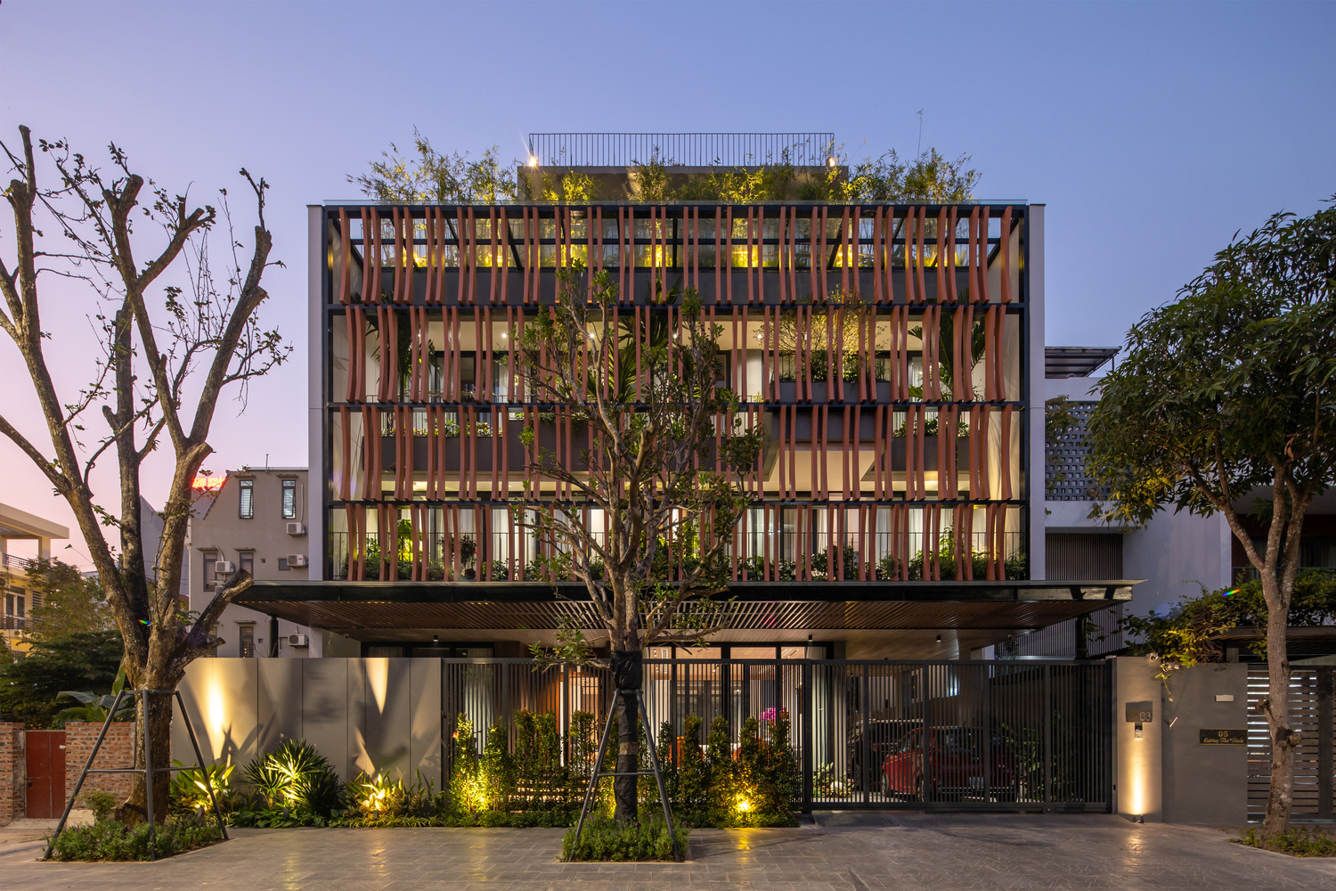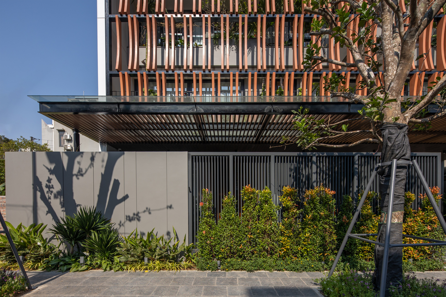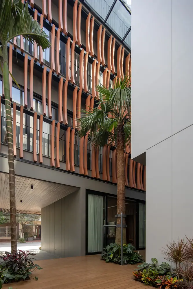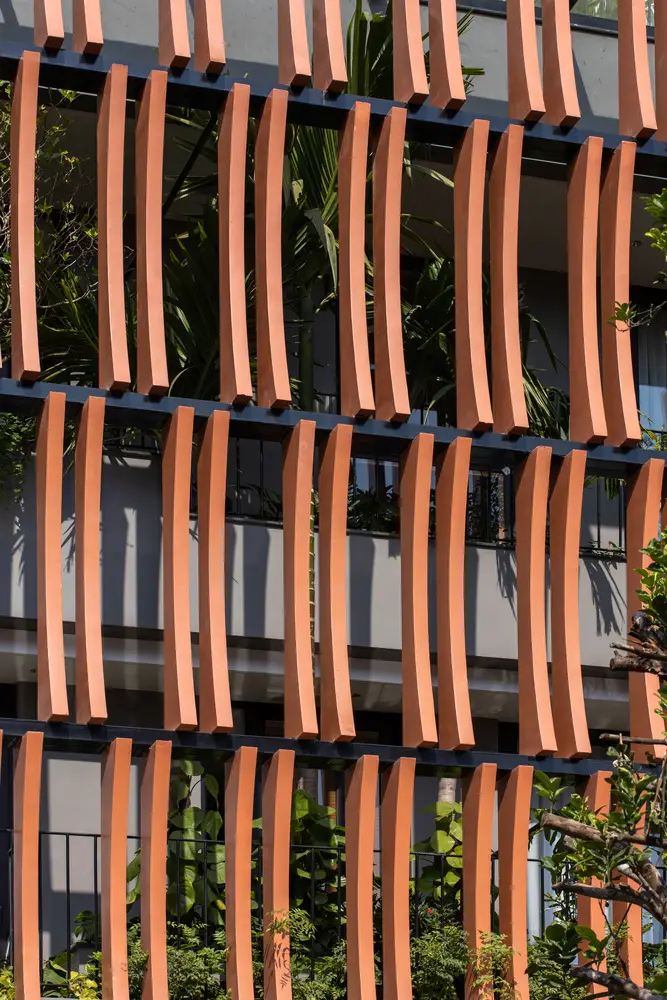 Mặt tiền kiến ​​trúc của tòa nhà tạo nên một lớp màu xanh lam gợi nhớ đến những ký ức truyền thống của người Việt Nam. Lớp kính này sẽ làm giảm cường độ ánh sáng mặt trời chiếu vào tòa nhà, đồng thời tăng thêm sự riêng tư cho các không gian sinh hoạt bên trong. Lớp vườn nằm giữa lớp màu xanh lam và các không gian sinh hoạt là một không gian trung gian giúp điều hòa vi khí hậu và làm nổi bật cảnh quan, tạo cảm giác thư thái cho tâm hồn con người.