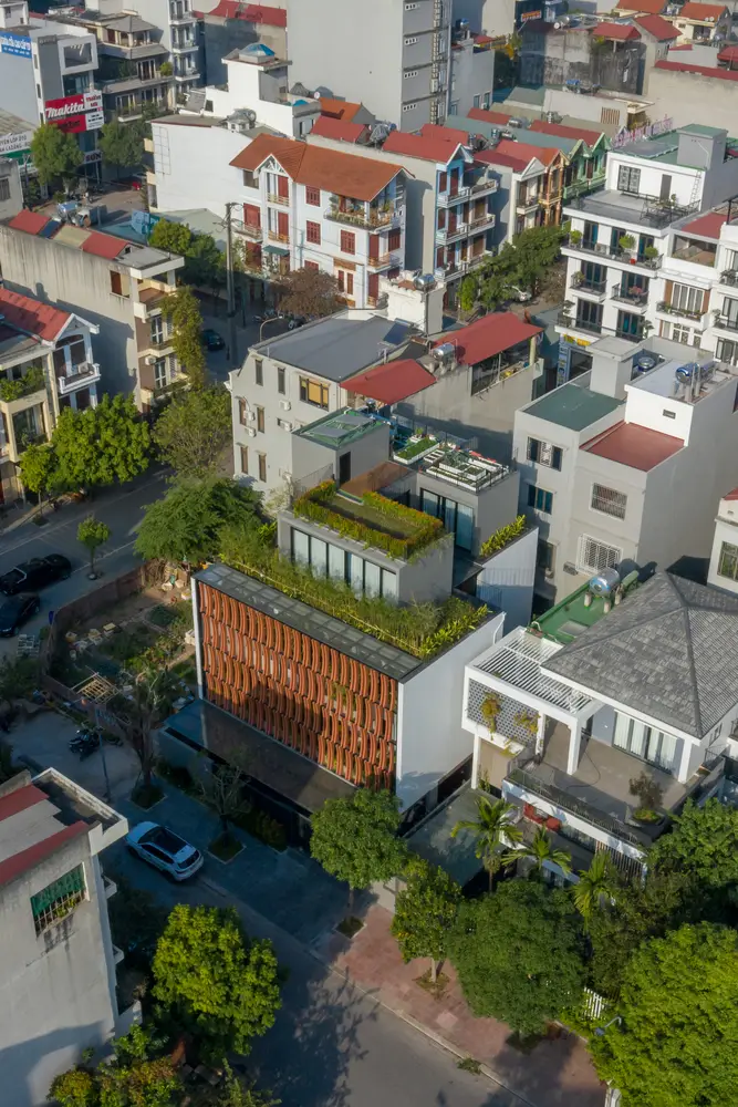 Mô tả thiết kế do các kiến ​​trúc sư cung cấp. Công ty kiến ​​trúc ARO đã tiếp cận nhu cầu của ngôi nhà dành cho 6 người và chia họ thành 3 thế hệ khác nhau. Tại các thành phố của Việt Nam, mức độ đô thị hóa rất cao, trong đó thành phố Bắc Giang là một thành phố công nghiệp. Miền Bắc Việt Nam có khí hậu nhiệt đới gió mùa và độ ẩm cao, không khí rất nóng vào mùa hè và rất lạnh vào mùa đông. Vì vậy, với những yêu cầu đặt ra như vậy, các kiến ​​trúc sư đã đưa ra một cách tiếp cận tự nhiên cho các chương trình sinh hoạt trong mọi không gian, giải quyết vấn đề nắng gắt vào mùa hè và giữ ấm vào mùa đông. Khu vực này sẽ là trụ cột cho những người sinh sống tại đây.