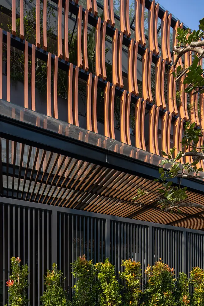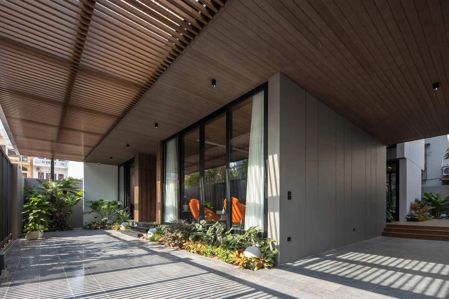 Ngôi nhà được tiếp cận thông qua một hành lang mở kết nối khu vườn và chỗ đậu xe, xen kẽ với các đường nét kiến ​​trúc tạo nên không gian mở giữa khu đất, tăng cường bề mặt tiếp cận tự nhiên. Thiên nhiên cho không gian.
