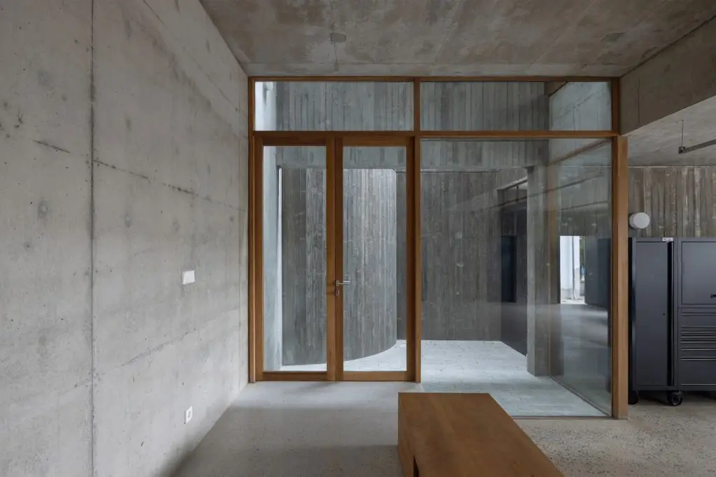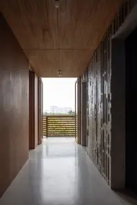 Sự kết nối trực tiếp nhất thể hiện qua ban công bên trong, một khoảng không nhỏ treo lơ lửng giữa một khoảng trống cao, tạo điều kiện cho những tương tác ngắn ngủi giữa hai vợ chồng. Về mặt không gian, các phòng của họ được kết nối theo chiều dọc thông qua hai khoảng trống chung, nơi ánh sáng và âm thanh truyền đi với cường độ khác nhau. Chính những khoảng trống này mang không khí mát mẻ đi khắp nhà, không chỉ tạo ra sự lưu thông nhiệt mà còn mang đến cảm giác sống chung vô hình, tôn vinh nhịp điệu riêng của mỗi người mà vẫn duy trì sự kết nối.