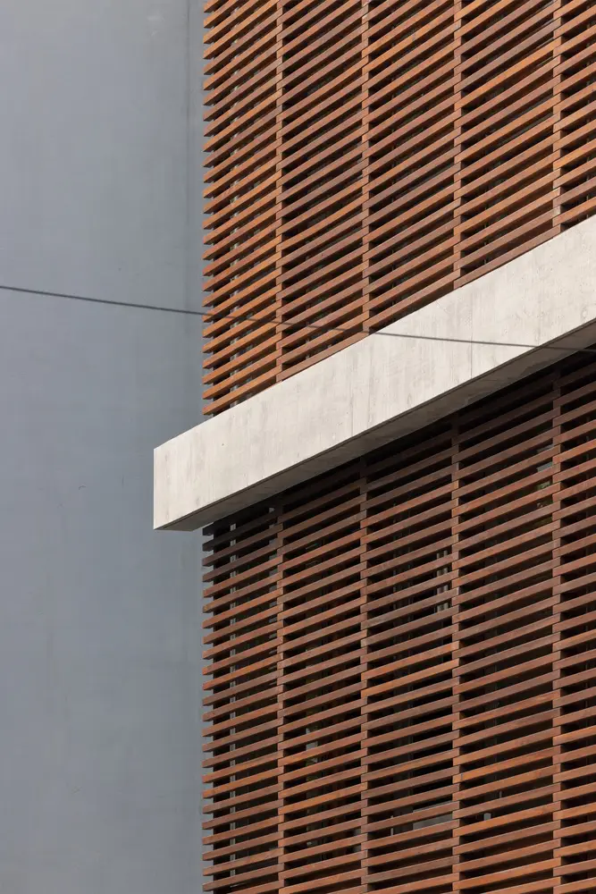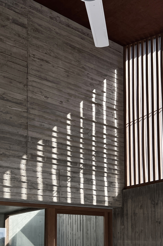 Ngôi nhà được cấu thành từ hai lõi thẳng đứng neo giữ hai đầu đối diện của khu đất, được kết nối bằng một tấm sàn nhịp. Một lõi tạo điều kiện thuận lợi cho việc di chuyển của con người, trong khi lõi còn lại dẫn luồng không khí qua một ống bê tông hở, lọc ánh sáng và dẫn không khí qua một sân bán ngoài trời. Các khoảng trống thẳng đứng nhiều lớp này tạo ra sự thông gió tự nhiên cho toàn bộ không gian sống. Ánh nắng mặt trời phía Tây được điều hòa bởi các mặt tiền có mái che và cửa chớp trượt lõi rỗng. Mặt tiền này có thể mở rộng vào những giờ mát mẻ buổi sáng và buổi tối để đón gió chéo. Mặc dù thiết kế không hướng đến việc trở thành một ngôi nhà thụ động tối ưu về nhiệt, nhưng nó cố gắng mang đến một giải pháp mang tính khu vực cho sự thoải mái về nhiệt trong một điều kiện đầy thách thức: một khu đô thị mật độ cao.