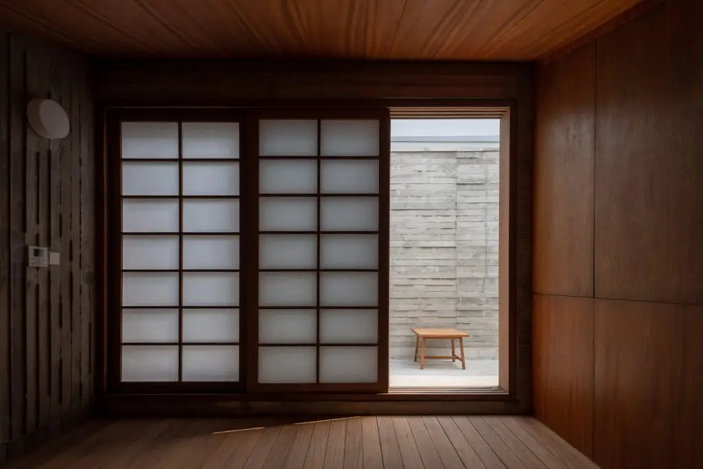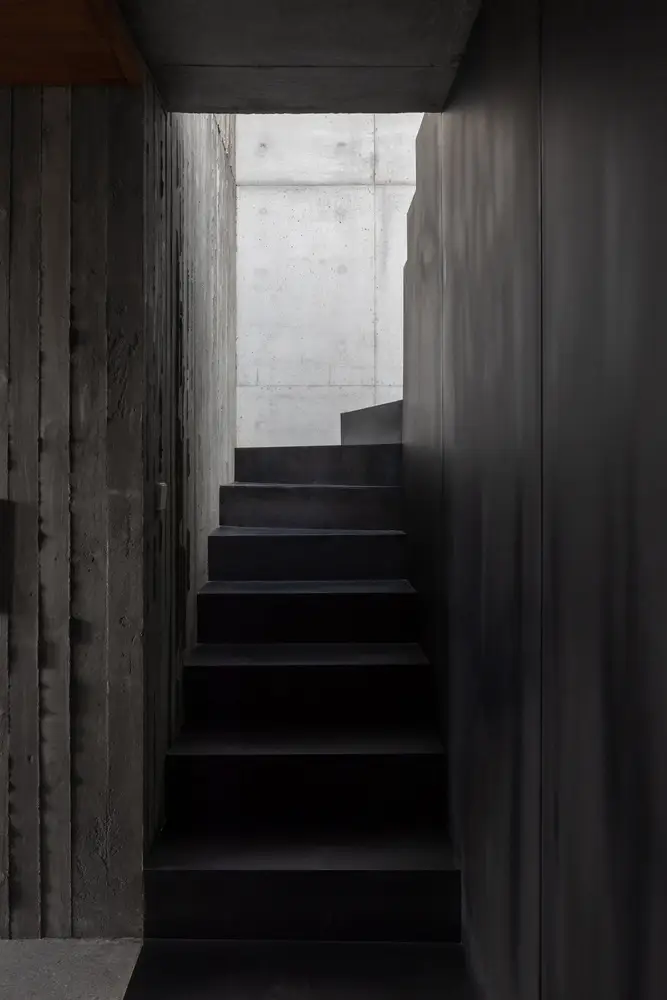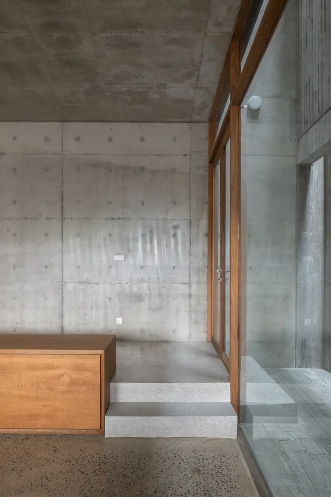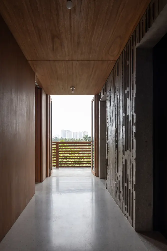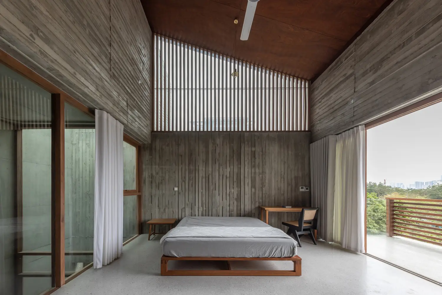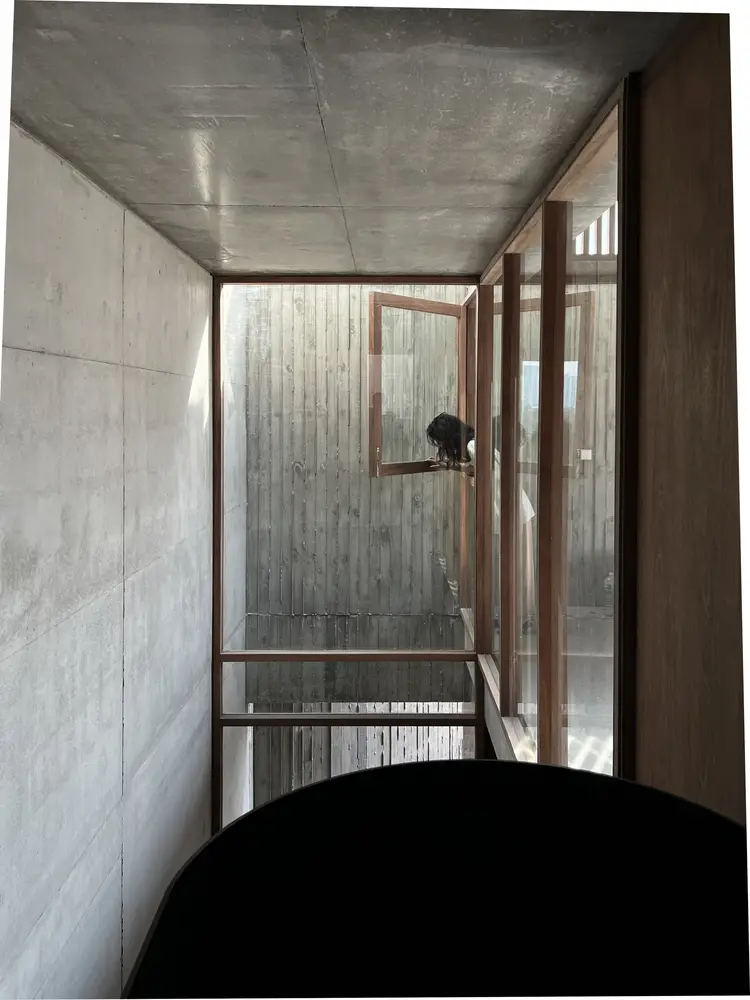 Sự kết nối trực tiếp nhất thể hiện qua ban công bên trong, một khoảng không nhỏ treo lơ lửng giữa một khoảng trống cao, tạo điều kiện cho những tương tác ngắn ngủi giữa hai vợ chồng. Về mặt không gian, các phòng của họ được kết nối theo chiều dọc thông qua hai khoảng trống chung, nơi ánh sáng và âm thanh truyền đi với cường độ khác nhau. Chính những khoảng trống này mang không khí mát mẻ đi khắp nhà, không chỉ tạo ra sự lưu thông nhiệt mà còn mang đến cảm giác sống chung vô hình, tôn vinh nhịp điệu riêng của mỗi người mà vẫn duy trì sự kết nối.