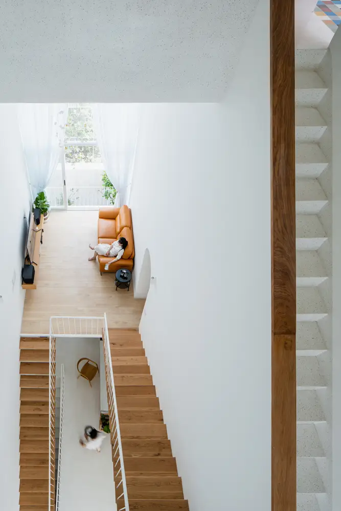 Những đường cong kết hợp với vật liệu chính là đá mài terrazzo cùng hiệu ứng ánh sáng từ các cửa sổ lớn, tạo nên một không gian sống mềm mại, thoáng đãng nhưng vẫn rất ấm cúng, gắn kết mọi thành viên trong gia đình. Ngôi nhà không quá phô trương nhưng đủ để lại ấn tượng khó phai cho những ai đã từng đi qua khu phố. Ban ngày, ngôi nhà như tan chảy dưới ánh nắng mặt trời, còn ban đêm lại lung linh với những ánh đèn màu ấm cúng.