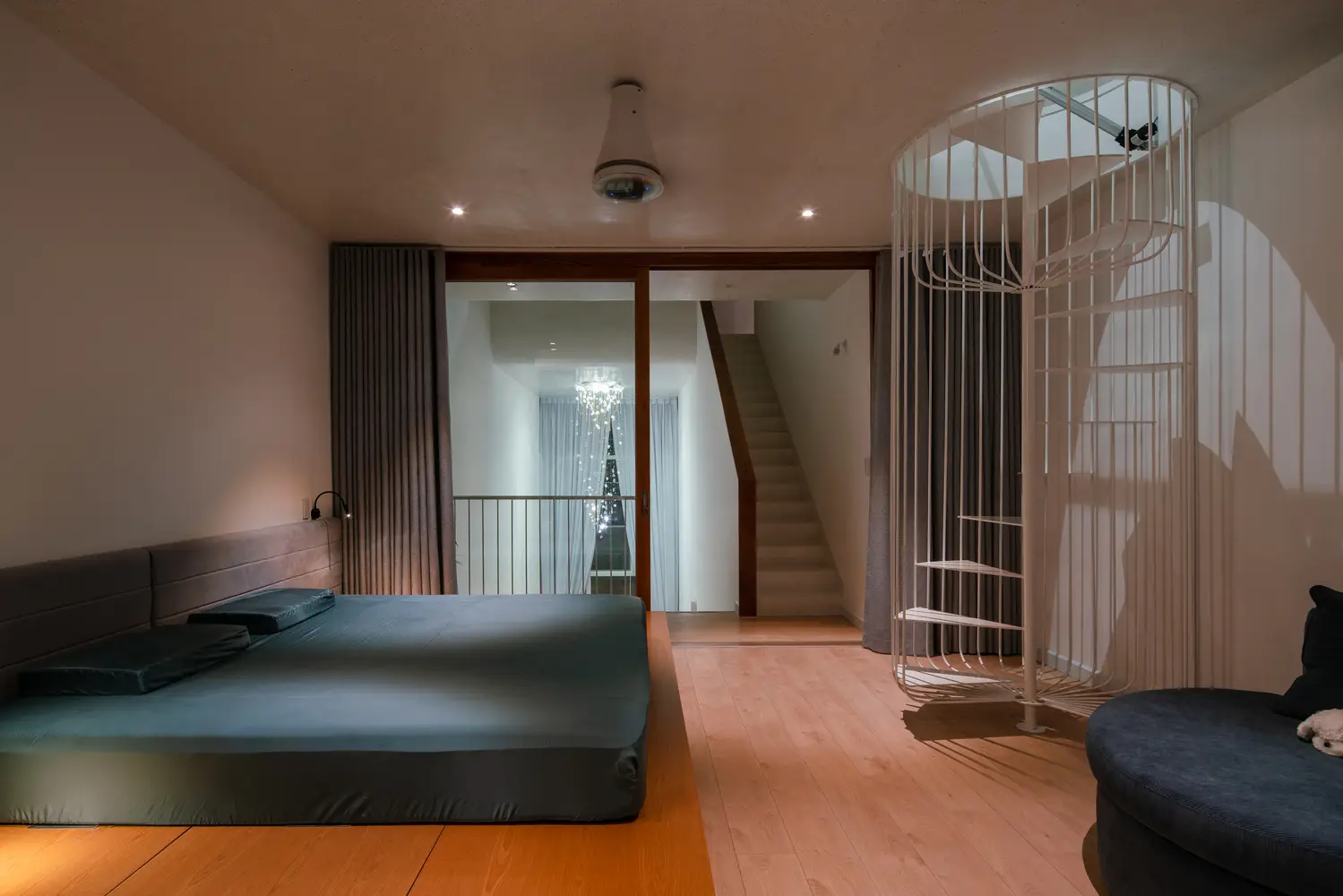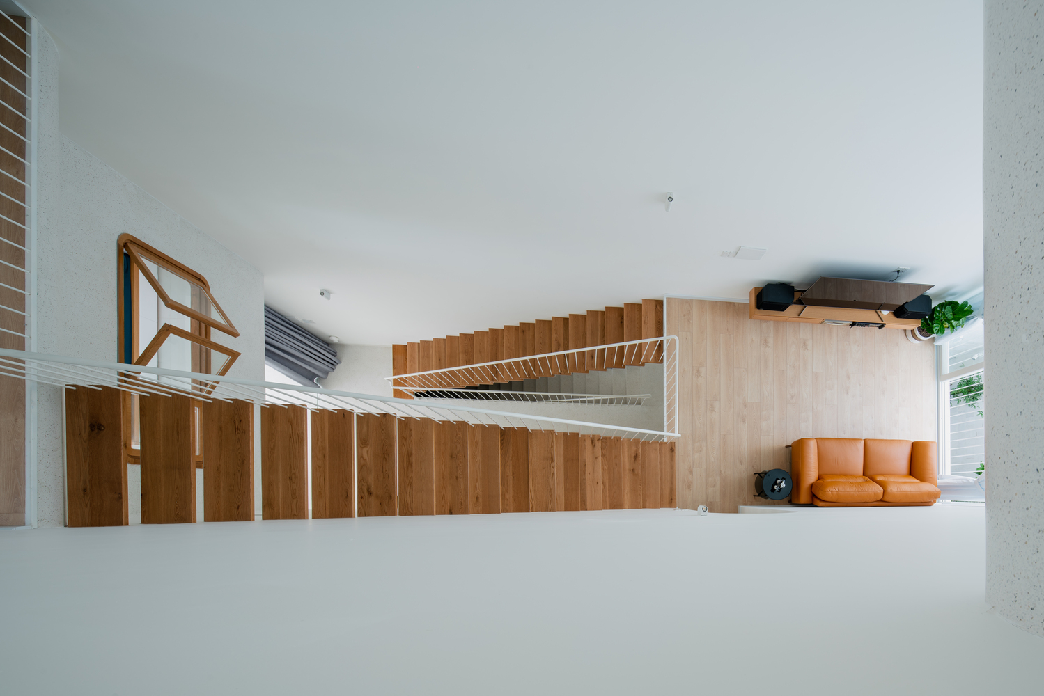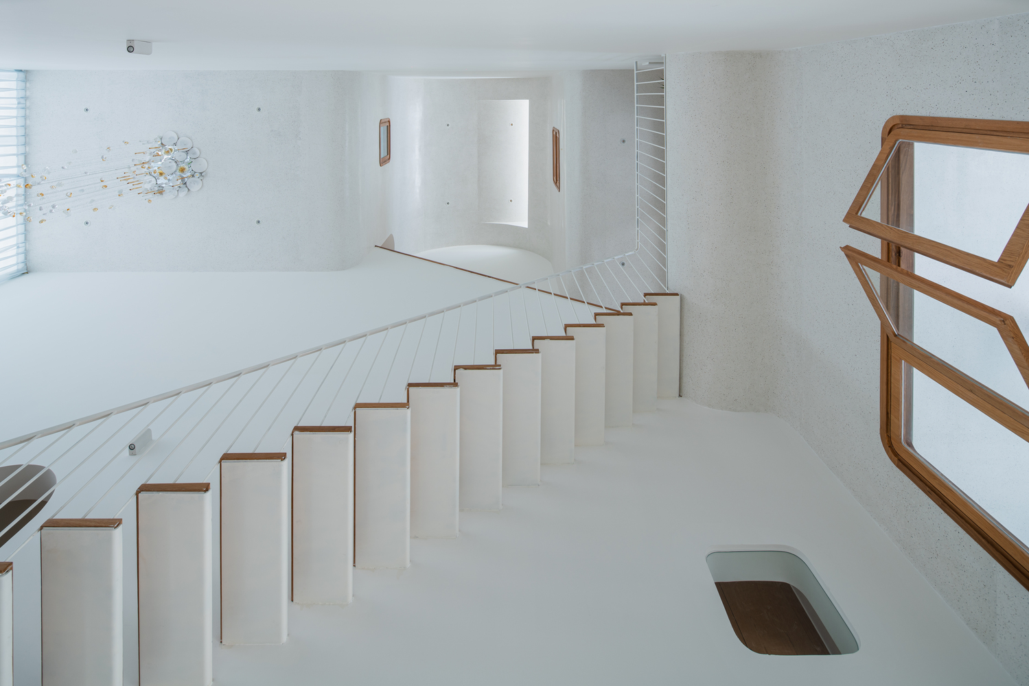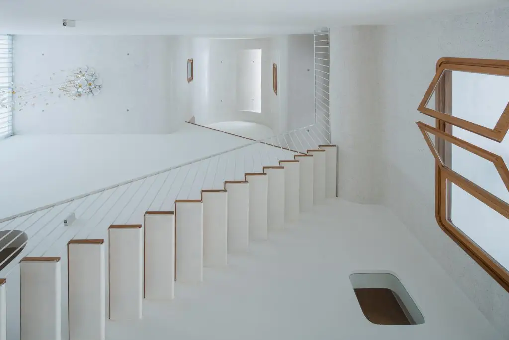 Không gian mở được kết nối với nhau bằng khoảng sáng sàn lớn, sử dụng đường cong để tạo nhịp điệu cũng như tính liên tục của sàn – tường – trần tạo nên những cấu trúc lúc thì bồng bềnh, lúc lại gợn sóng, tích tụ mỗi khi góc nhìn thay đổi.
