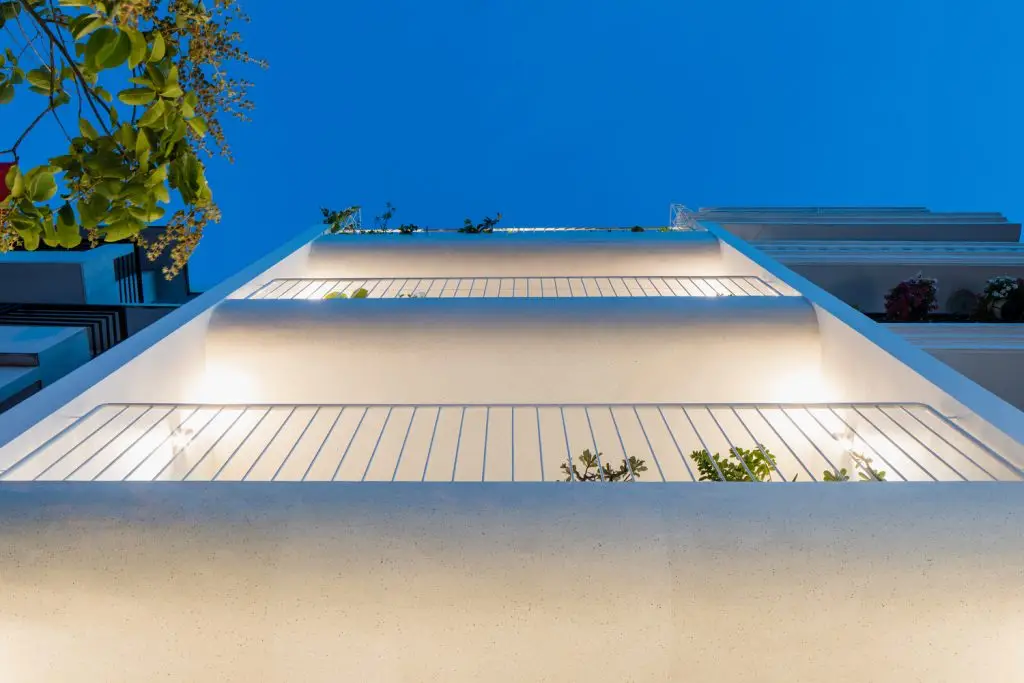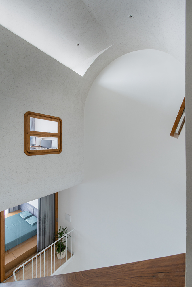 Những đường cong kết hợp với vật liệu chính là đá mài terrazzo cùng hiệu ứng ánh sáng từ các cửa sổ lớn, tạo nên một không gian sống mềm mại, thoáng đãng nhưng vẫn rất ấm cúng, gắn kết mọi thành viên trong gia đình. Ngôi nhà không quá phô trương nhưng đủ để lại ấn tượng khó phai cho những ai đã từng đi qua khu phố. Ban ngày, ngôi nhà như tan chảy dưới ánh nắng mặt trời, còn ban đêm lại lung linh với những ánh đèn màu ấm cúng.